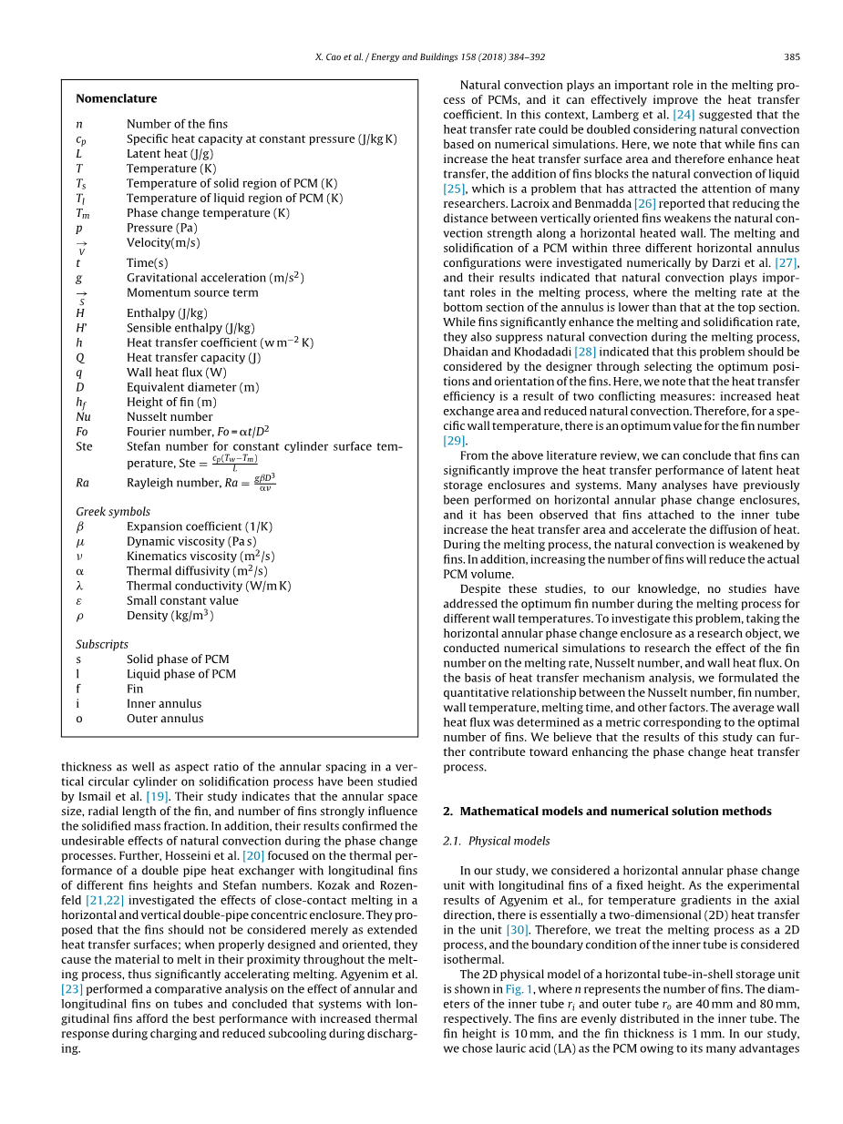 在我们的研究中,我们考虑了纵向翅片为固定高度时水平环形相变单元值。根据Agyenim等人关于轴向温度梯度的实验结果,单元中基本上具有二维(2D)热传递[30]. 因此,我们将熔化过程视为2D过程,内管的边界条件被认为是等温的。