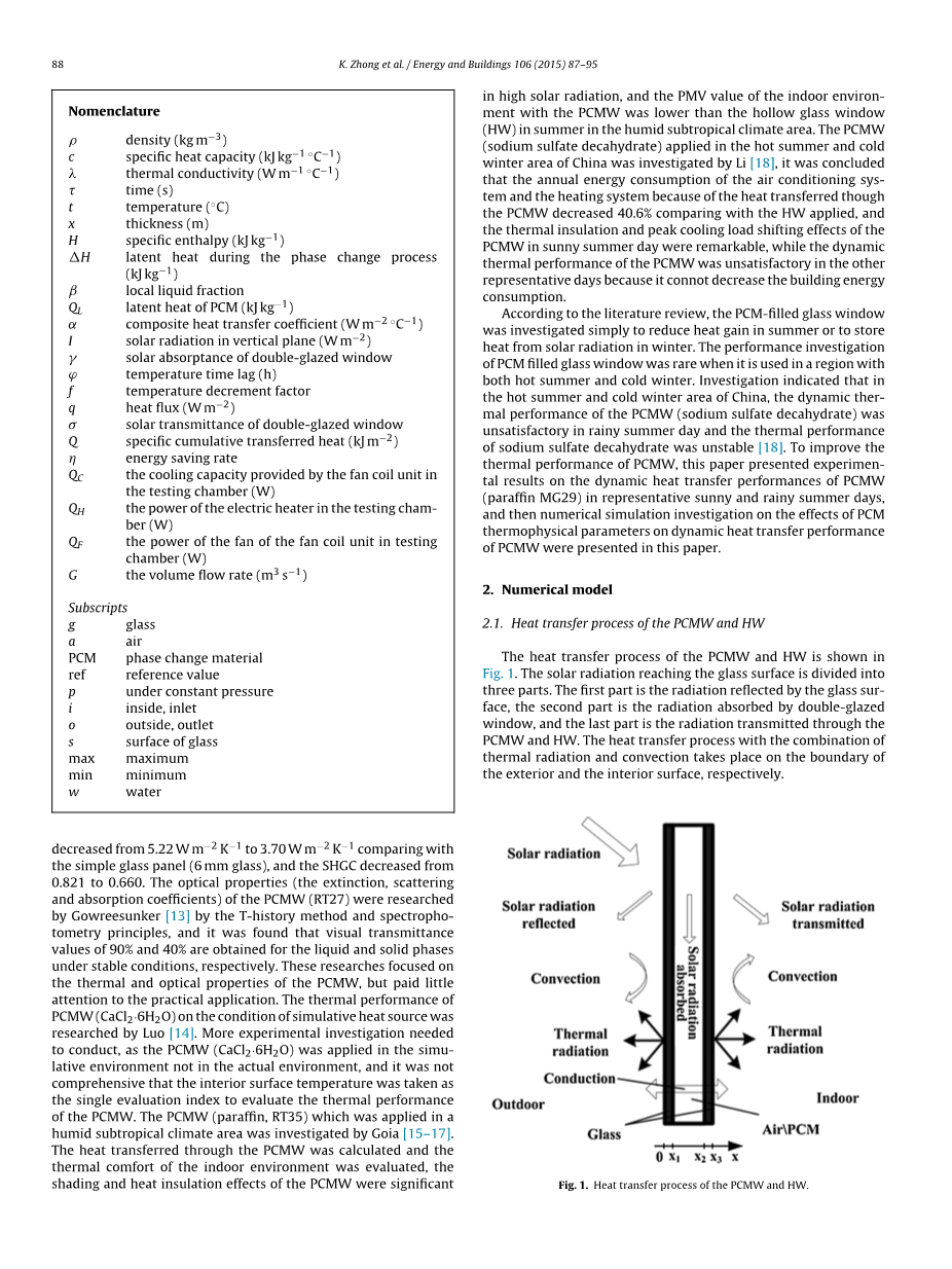 根据文献回顾,对相变材料填充玻璃窗进行了简单的调查,以减少夏季的热量增加,或者在冬季储存太阳辐射的热量。 用于夏热冬冷地区的PCM玻璃窗的性能调查很少。 调查结果表明,在夏热冬冷地区,夏季炎热天气下PCMW(十水硫酸钠)的动态热学性能不理想,十水硫酸钠热性能不稳定[18]. 为了提高PCMW的热性能,本文提出了PCMW(石蜡 MG29)在有代表性的晴天和下雨天的动态换热性能的实验结果,并对PCM热物理参数对动态换热性能的影响进行了数值模拟研究本文介绍了PCMW的概念。