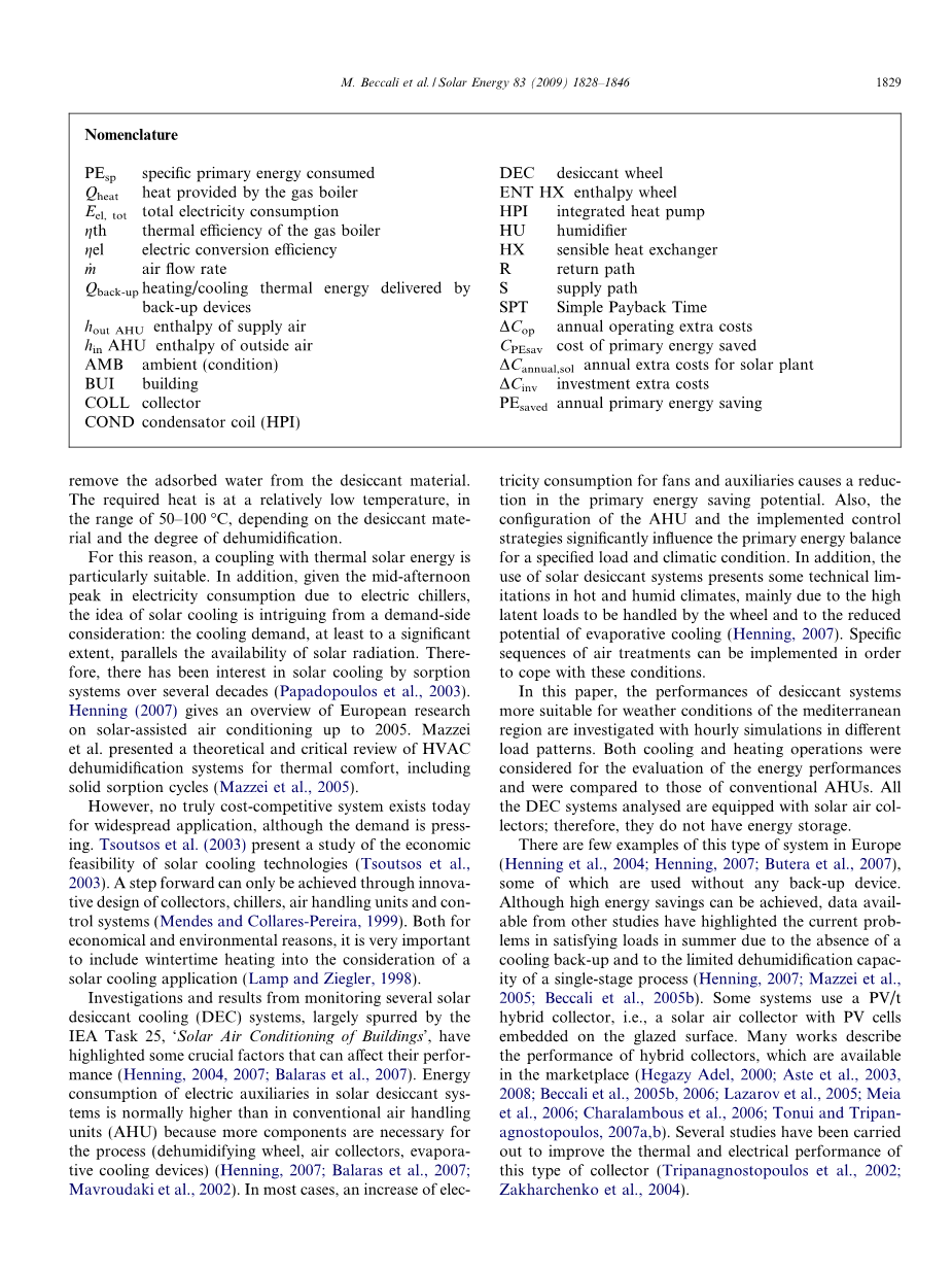 在欧洲有这种类型的系统的几个例子(Henning et al.,2004;Henning,2007;布泰拉et al.,2007),其中一些是不使用任何备用装置的。虽然可以节省大量的能源,但从其它研究中得到的数据突出表明了无法满足夏季负荷的问题是因为缺少一个冷却备用设备和单级过程中有限的除湿能力。(Henning,2007;马泽伊et al.,2005;beccali等人,2005)。有些系统使用混合光伏/热集热器,即太阳能电池集热器,太阳能电池嵌入在玻璃表面。许多产品显示了混合式集热器的性能,这些产品都可以在市场上买到。(Hegazy Adel,2000;阿斯特et al.,2003, 2008;beccali et al.,2005b,2006;拉扎洛夫等人,2005;MEIA et al.,2006;Charalambous et al.,2006;tonui和Tripanagnostopoulos,A,B)。已经进行了几项研究来改进集热器的热电性能(Tripanagnostopoulos等,2002;Zakharchenko等,2004)。