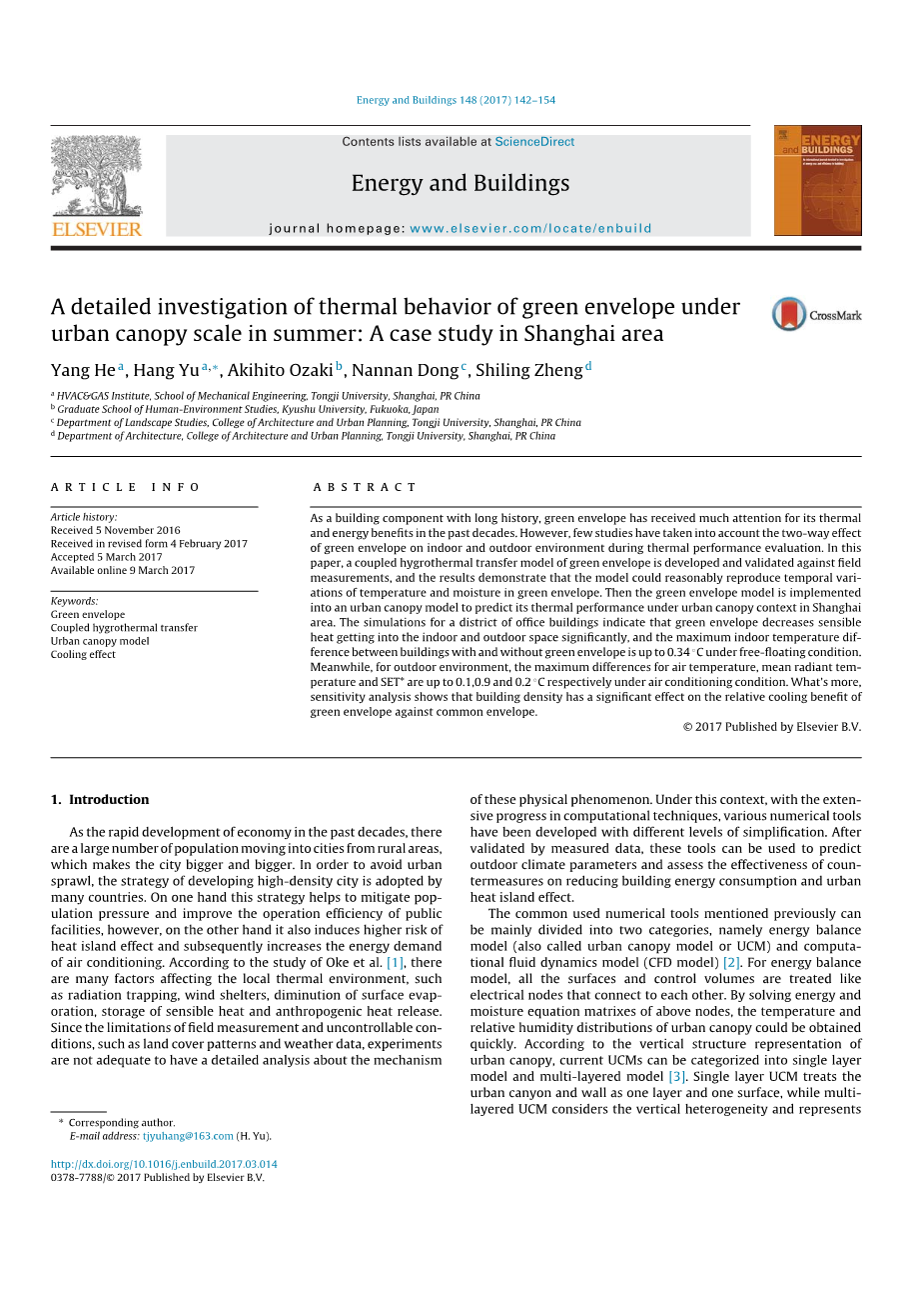 众所周知,绿色围护结构的传热过程是涉及阴影,蒸发,隔热和储存效果的复杂过程。除了前面提到的因素外,绿色围护结构的热性能还取决于植物和基质的湿热性质。因此,很难将绿色围护结构的热性能从一个地方推断到其他地区。为了综合评价上海地区城市环境下绿色环境的热性能,本文开发了绿色围护结构的热湿耦合模型,并通过现场实验数据验证。然后,该模型与多层城市冠层模型AUSSSM相结合[28]分析不同场景下绿地的热行为,同时考虑城市林冠气候对当地气候的影响。
