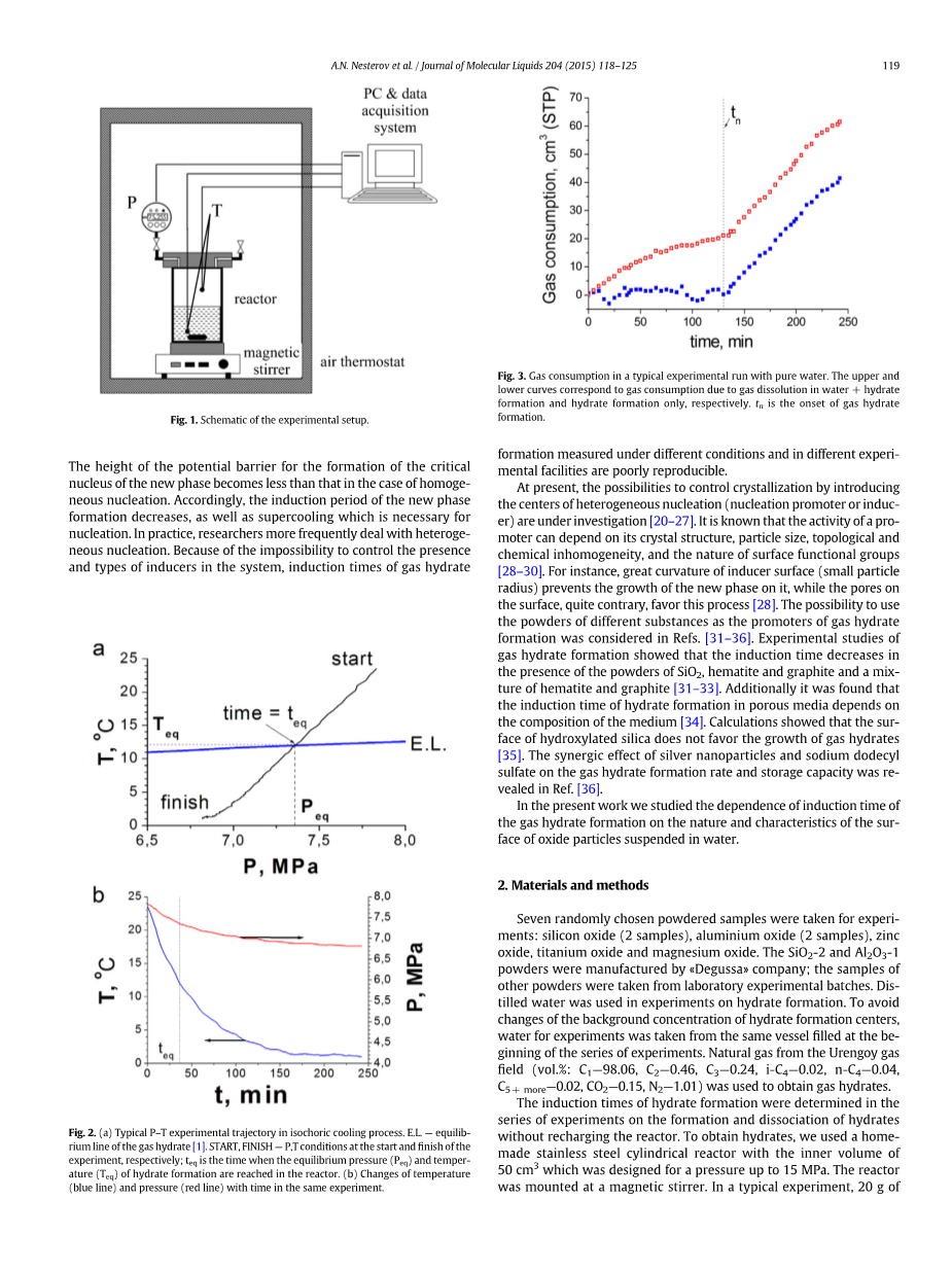 实验使用了七个随机选择的粉末样品:氧化硅(2个样品)、氧化铝(2个样品)、氧化锌、氧化钛和氧化镁。SiO2-2和Al2O3-1粉末由Degussa公司制造;其它粉末样品取自实验室。蒸馏水用于水合物形成实验。为了避免水合物形成时背景浓度的变化,实验用水取自相同的容器。使用Urengoy气田的天然气(С1-98.06,С2-0.46,С3-0.24,i-С4-0.02,n-C4-0.04,C5 more-0.02,СО2-0.15,N2-1.01)。