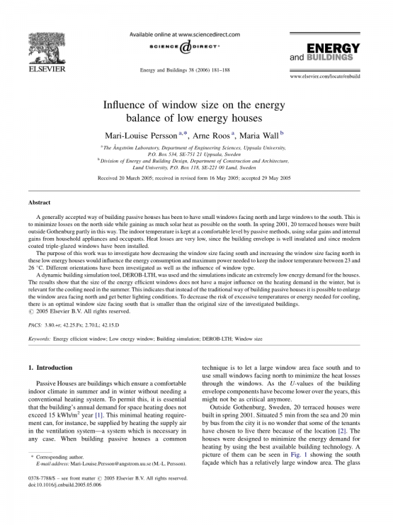 建造低能耗房屋以最大限度地减少温带气候下的供暖能源需求。由于它们比普通房屋需要更少的能量,因此它们也将减少免费太阳能的利用。通常被动房屋建有朝南的较大窗户区域以收集太阳能,但在这种情况下,问题是:尺寸是否重要?在本节中,将介绍和分析模拟的一些结果。结果基于本文作者[2,7,8]的早期工作。
