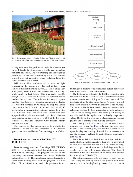 2001年春天在瑞典哥德堡外建造了20栋梯田屋。距离大海5分钟路程,距离市区20分钟车程,难怪有些租户因为地理位置而选择住在那里[2]. 这些房屋的设计旨在通过使用最好的建筑技术最大限度地减少供暖的能源需求。它们的图片可以在图1中看到,显示了具有相对大的窗口区域的南立面。其玻璃阳台护栏的设计不会遮挡窗户。在北面,窗户面积比正常小,以减少热量损失。屋顶悬垂和阳台防止房间在夏季期间过热,但在冬季太阳较低时不要减少入射辐射。
