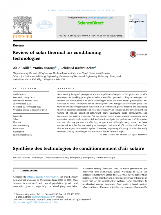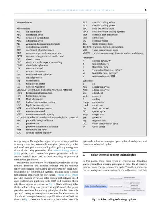与此同时,解决全球能源需求增长和气候变化的一个解决方案将是利用可再生能源来提供制冷,而不是使用化石燃料的空调系统,使太阳能制冷技术对我们的未来非常重要。Hwang et al.(2008)根据2007年以前发表的文献综述了各种太阳能制冷技术,并将其分为三组,如图1所示。由于利用太阳能电冷却是非常直接的,本文提供了概述太阳能热操作咕咕技术的工作原理,并根据2008年以来的出版物综述了此类技术的进展。如图1所示,太阳热循环主要有三个周期,操作冷却技术分为开循环、闭循环和热机械循环。