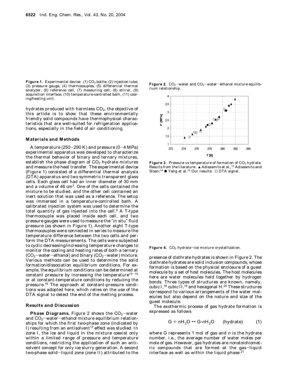在先前的工作[5]中开发了一种非机械式发电机,通过将水性混合物的热力学平衡转换为固液混合物的热力平衡,并添加第三种成分(例如CO2)来生产两相二次制冷剂。使用这种方法,一方面有利于CO2水合物-水混合物的形成,从而在适用于二级流体的广泛温度范围内利用其潜热。此外,根据Sloan[4]的研究结论,一些水合物具有类似于冰的潜热。与长期以来一直在寻求抑制这些水合物形成的石油公司[4,6,7]不同,目前的研究充分利用了CO2水合物的最佳分解焓。尽管在制冷应用中使用其他水合物(例如CFC、HCFC水合物)[4,8-12]作为相变材料已有很多年了,但是由于以下原因,目前禁止使用具有高全球变暖潜能值(GWP)的功能性CFC和HCFC材料。本文的目的是利用无害的CO2生成水合物,从而证明这些环境友好型的固体化合物具有的热物理特性非常适合于制冷应用,尤其在空调领域。