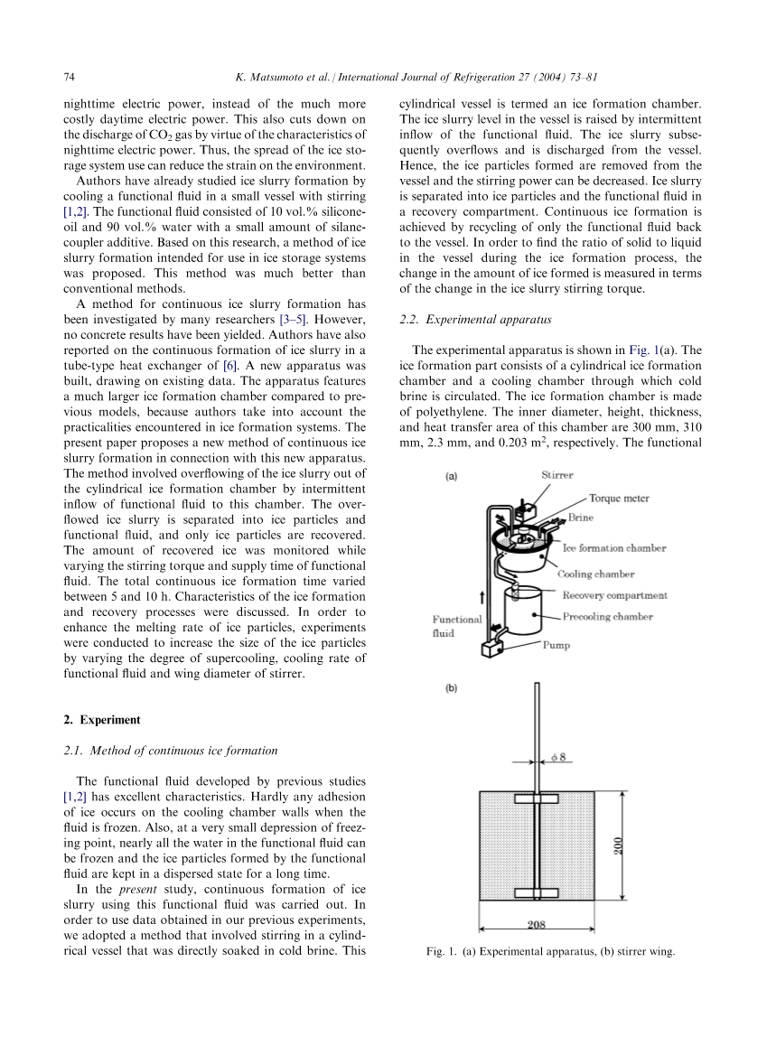 一种持续制作冰浆的方法已被许多研究者研究[3-5]。但是,没有具体的结果得出。作者也发表了文献[6]——关于在管式换热器中冰浆的持续制取。在现有数据的基础上一种新仪器被建造出来。因为作者考虑了在结冰系统中会遇到的实际情况,所以该模型与以前的模型相比有更大的结冰室。本文结合该装置提出了一种持续制取冰浆的方法。这种方法包括将冰浆从圆柱形冰室中溢出。将溢出的冰浆分离为冰粒和功能性流体,并只回收冰粒。在改变搅拌扭矩和功能性流体供给时间的同时监测回收的冰量。总持续制冰时间在5~10h。讨论了冰的形成和融化特点。通过改变过冷度、功能性流体的冷却速率和搅拌器翼径,提高了冰粒的融化速度。
