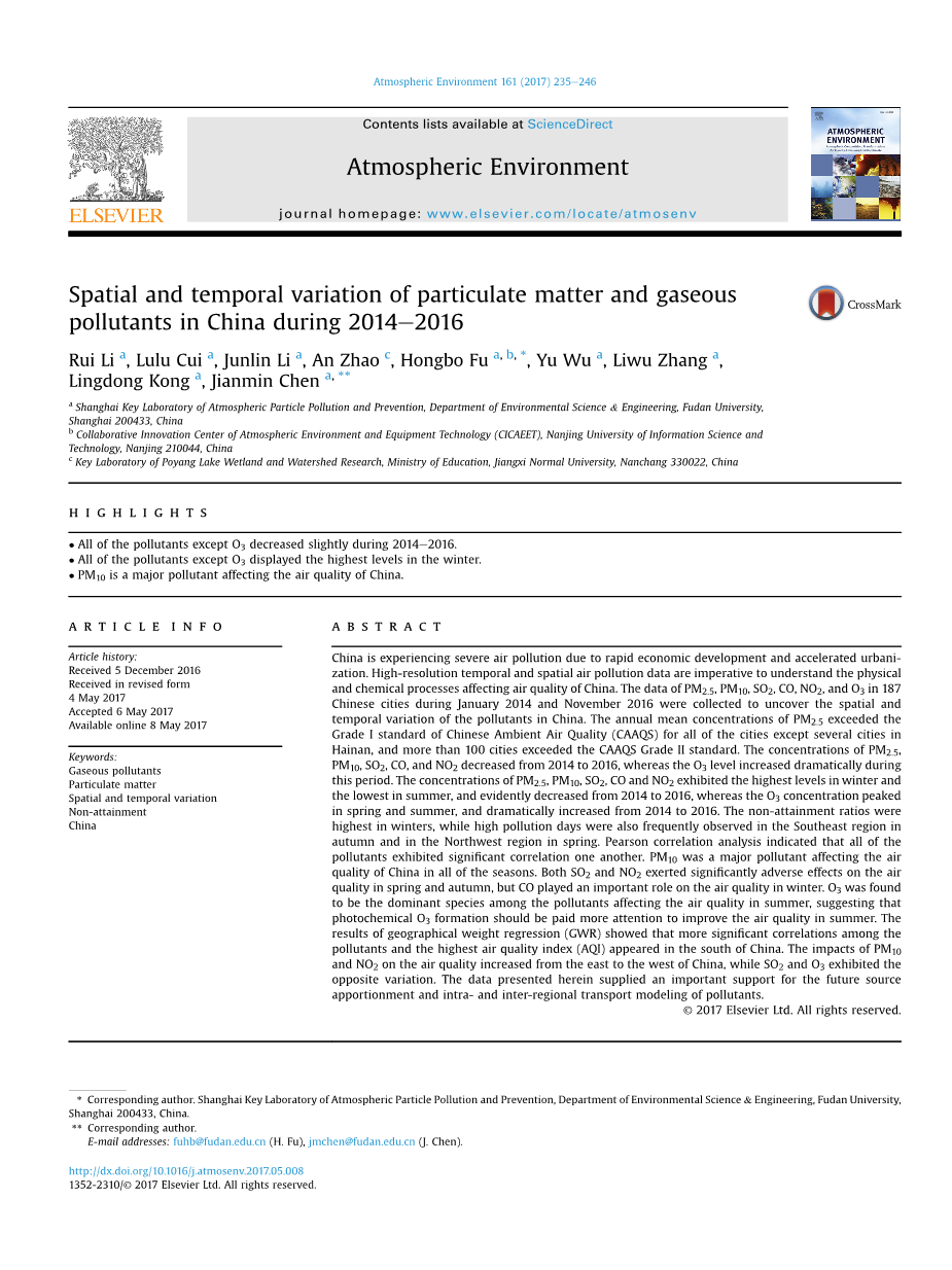 摘要:中国经济快速发展,城市化进程加快,空气污染严重。 高解析度的时空大气污染数据对于了解影响中国大气质量的物理化学过程势在必行。 收集2014年1月至2016年11月中国187个城市的PM2.5,PM10,SO2,CO,NO2和O3的数据。发现中国的污染物除了海南几个城市外,全年城市PM2.5的年平均浓度均超过中国环境空气质量一级标准(CAAQS),一百多个城市超过了CAAQS二级标准。2014年至2016年,PM2.5,PM10,SO2,CO和NO2浓度下降,而O3浓度在此期间急剧上升。PM2.5,PM10,SO2,CO和NO2含量在冬季最高,夏季最低,2014 - 2016年明显下降,春季和夏季浓度达到峰值,2014年至2016年大幅度增加。冬季不达标率最高,东南地区的秋季和西北地区的春季常见高污染天数。Pearson相关分析表明,所有的污染物都表现出显著的相关性。 PM10是影响中国所有季节空气质量的主要污染物。 SO2和NO2对春、秋季空气质量都有显著的不利影响,但CO对冬季空气质量起着重要的作用。O3是夏季影响空气质量的主要污染物之一,说明夏季应重视光化学物质的形成,以改善空气质量。结果显示,南方地区污染物与空气质量指数(AQI)之间存在较显著的相关性。PM10和NO2对空气质量的影响从东部向西部增加,SO2和O3则呈现相反的变化。本文提供的数据为未来的污染源分配和区域内和区域间污染物运输模型提供了重要支持。