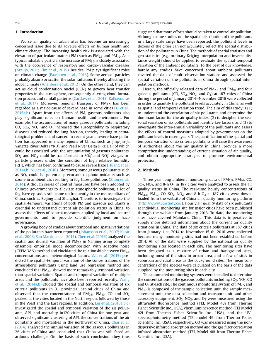 越来越多的关于污染物时间和空间变化的研究已被报道(Johansson等,2007; 卡拉尔 等人,2006; San Martini等人,2015年,陈等人)。利用自动适应噪声全套经验模式分解(CEEMDAN)方法分析了南京地区PM2.5的空间变化和日变化特征,阐明了PM2.5浓度与气象因子的关系。利用土地回归方法预测了大气污染物浓度的时空变化,得出结论:PM2.5表现出比空间变化更明显的时间变化。 最近也报道了多个地区和污染物的时空变化。研究了中国31个省会城市6种标准污染物的时空变化,并观察到在北方地区,PM2.5,PM10,CO和SO2浓度达到峰值。 此外,刘等人 (2016a,B,C) 调查了中国120个城市空气污染物,空气污染指数和死亡率的时空变化情况,观测了API的显着聚集,西北地区大气污染物浓度和死亡率。柴等(2014) 分析了中国26个城市的气态污染物年变化情况,认为中国仍面临着严峻的挑战。在这样的结论的基础上,他们就这样建议加大力度控制空气污染。尽管已经有大量的污染物空间分布研究报道,但是几十个城市的污染物浓度并不能准确反映我国污染物的空间分布。 应用空间统计和地理统计方法(如普通的克里格插值和反距离权重)来评估环境污染物的时空变化。 据我们所知,几乎没有研究关注环境污染物覆盖多个观测站的数据,并通过空间插值方法评估中国污染物的空间变化。