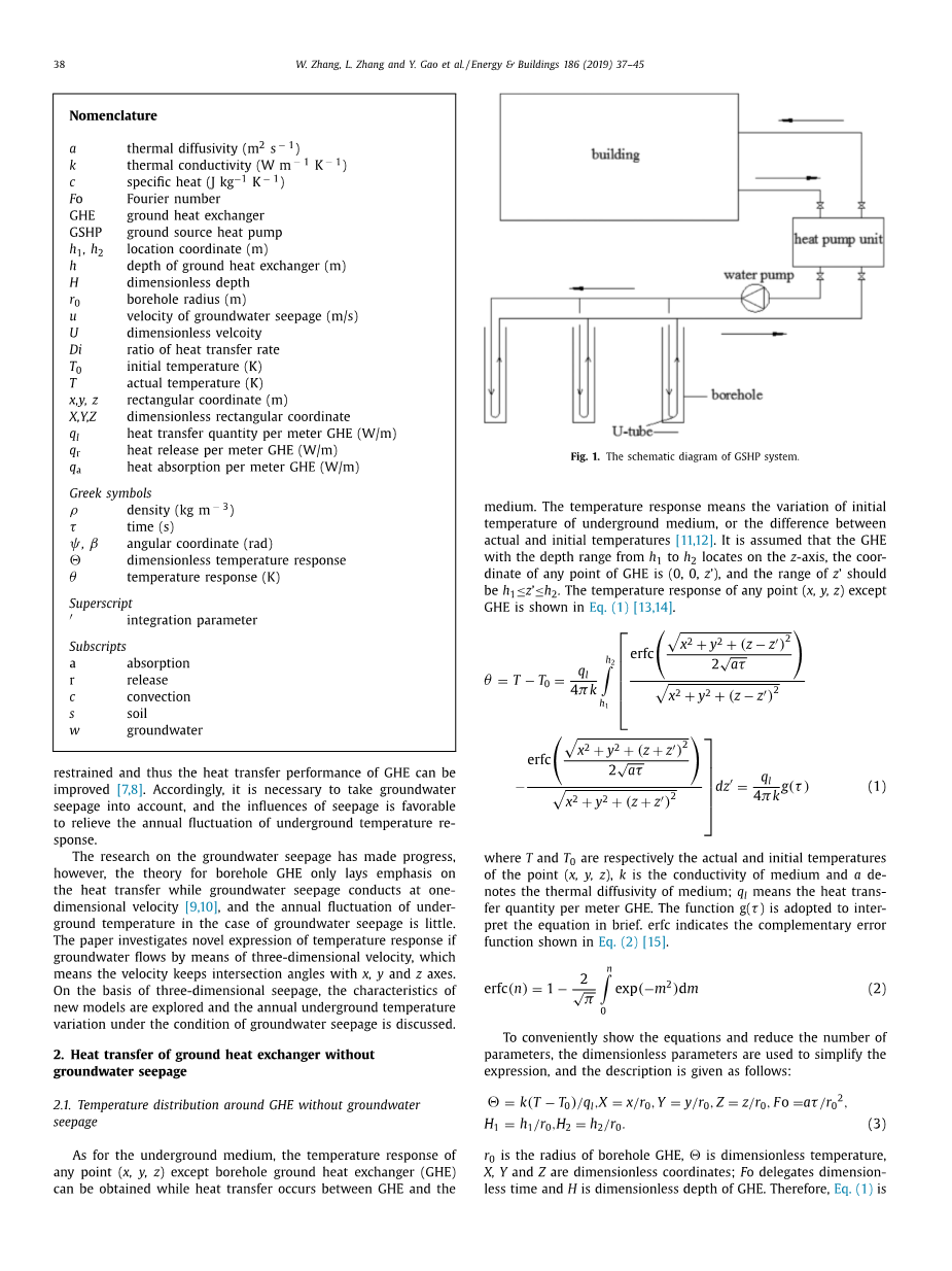 式中T和分别为点(x,y,z)的实际温度和初始温度,k为介质的导电率,a为介质的热扩散率,为每米GHE的传热量。简单地用函数g(tau;)来解释方程。erfc表示等式(2)中所示的互补误差函数。