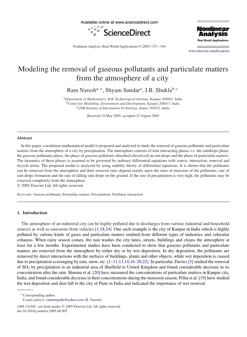 由于工业城市的气氛可能受到严重污染,因此研究清除机制很重要,例如通过雨水清除污染物,这可能有助于降低气体浓度以及有害人体健康的微粒物质,植物生命和财产。 雨水对污染物的去除机制涉及大雨期间的相互作用过程,在两个不同阶段发生的化学反应对去除过程的影响可以忽略不计[15,21]。 已经提出了几种线性数学模型来研究通过考虑雨水冲刷的特定气体的去除机理,其考虑了大气中雨滴的均匀分布,其仅涉及与考虑中的气体的浓度成比例的一阶动力学[2-4 ,7-9,11,13,22,23]。 在我们的研究中,所提出的非线性模型已经表明,
