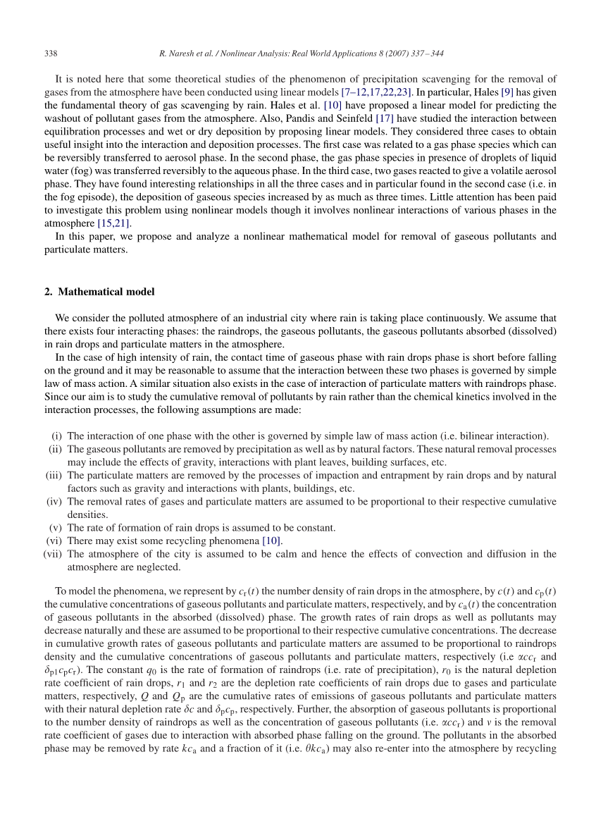 这里指出,已经使用线性模型进行了一些关于从大气中去除气体的沉淀清除现象的理论研究[7-12,17,22,23]。 特别是,Hales [9] 给出了雨水清除气体的基本理论。 Hales等人。 [10] 已经提出了预测大气中污染气体冲刷的线性模型。 还有Pandis和Seinfeld [17] 通过提出线性模型研究了平衡过程与湿或干沉降之间的相互作用。 他们考虑了三个案例,以获得对相互作用和沉积过程的有用见解。 第一种情况涉及可以可逆转移到气溶胶相的气相物质。 在第二阶段,液态水(雾)液滴存在下的气相物质可逆地转移到水相中。 在第三种情况下,两种气体反应产生挥发性气溶胶相。 他们在所有三种情况中发现了有趣的关系,特别是在第二种情况下(即在雾中)发现了气体物种的沉积增加了三倍。 尽管它涉及大气中各相的非线性相互作用,但很少关注使用非线性模型来研究这个问题[15,21]。