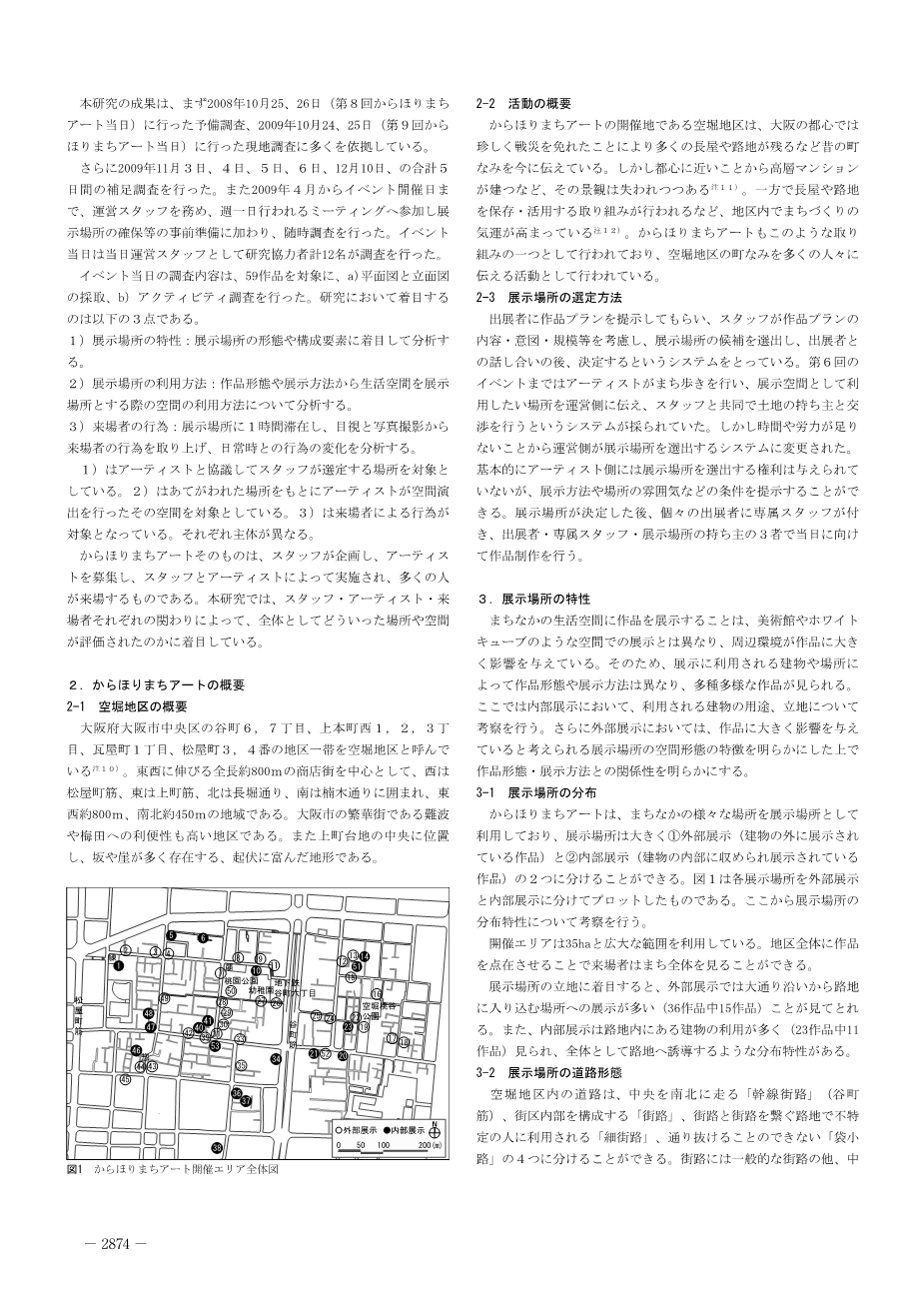 2009年举办的第九届空堀城市艺术展览,已经成长为有1万人以上的来场者造访的活动。人们被吸引而来的原因不仅仅是都市和艺术的融合,还有展示场所的空间构成和展示手法,以及在从生活空间变化到展示空间时的空间的特征和艺术作品引起了到场者的行为进行分析。