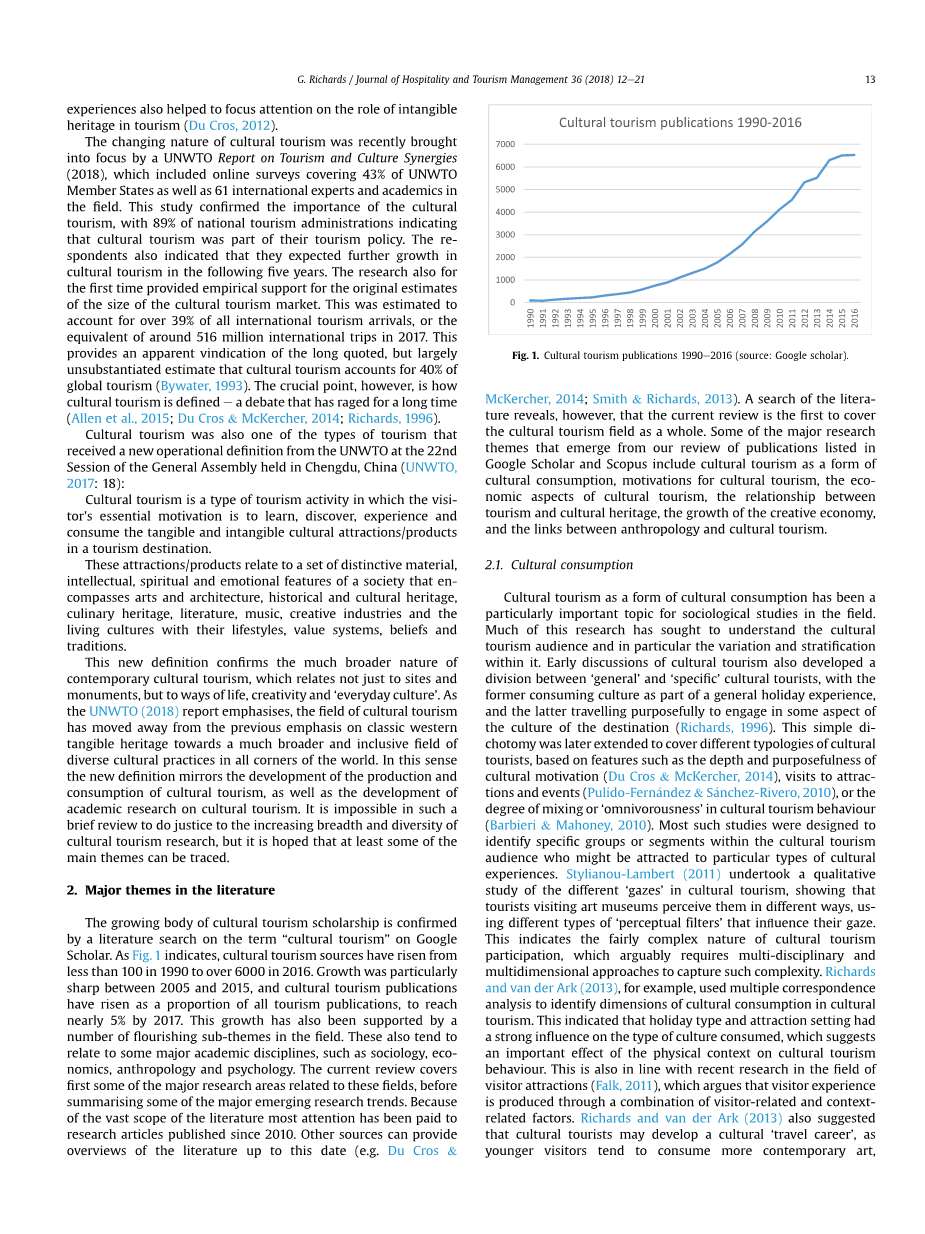 文化旅游奖学金的不断增长是由谷歌学者对“文化旅游”一词的文献搜索所证实的。如图1所示,文化旅游资源从1990年的不足100个增加到2016年的6000多个。2005年至2015年期间增长尤为迅猛,文化旅游出版物占所有旅游出版物的比例上升,到2017年达到近5%。这一增长也得到了该领域许多富有感染力的子主题的支持。这些也往往与一些主要的学术学科有关,如社会学、生态经济学、人类学和心理学。在总结一些主要的新兴研究趋势之前,目前的综述首先涵盖了与这些领域相关的一些主要研究领域。由于文献范围广泛,2010年以来发表的研究文章受到了最多的关注。其他来源可提供迄今为止的文献综述(如杜克罗斯)amp;McKercher,2014年;Smithamp;Richards,2013年)。然而,对文学的研究表明,当前的评论首先涵盖了整个文化旅游领域。从我们对Google学者和Scopus所列出版物的评论中得出的一些主要研究主题包括文化旅游作为文化消费的一种形式、文化旅游的动机、文化旅游的经济方面、旅游业与文化遗产的关系、创意经济的增长和旅游业的发展。他将人类学与文化旅游联系起来。