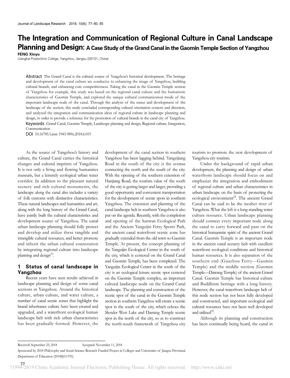 摘要 大运河是扬州历史发展的文化源泉。运河文化的传承和发展有利于提升扬州形象, 打造文化品牌,增强核心竞争力。以扬州高民寺段运河为例,本研究以区域运河文化 和高民庙的人文特色为基础,探索了运河的重要景观节点的独特的文化交流模式。通过对该区景观的现状和发展的分析,总结出相应的文化定位内容和方向,分析了区域文化在景观规划设计中的整合与传播思路,为扬州运河城的文化品牌的推广提供参考。