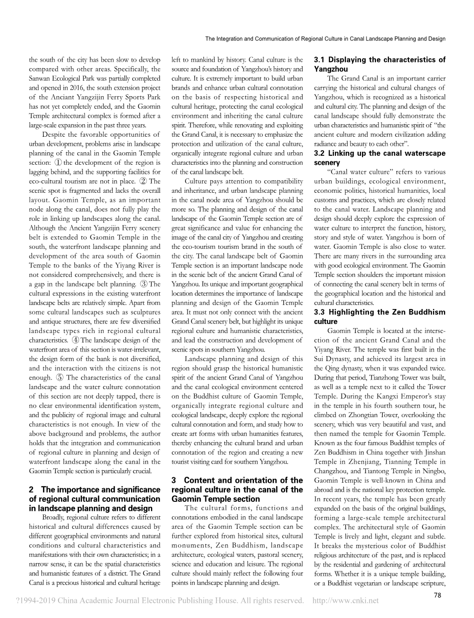 尽管有良好的城市发展机遇,但高明寺段运河景观规划出现了问题:① 该地区发展滞后,生态文化旅游配套设施不到位。②景区分散,缺乏整体布局。高明寺作为沿运河的重要节点,并没有充分发挥沿运河连接景观的作 用。虽然古代扬子金渡口风景带延伸 至南部的高民寺,但是高民庙以南地 区至益阳河畔的滨水景观规划和开发 并未全面考虑,景观带也存在差距。 规划。③现有滨水景观带的文化表现 形式相对简单。除了一些文化景观, 如雕塑和古董建筑,几乎没有多样化 的景观类型富有地域文化特色。④本区滨水区景观设计与水无关,银行设 计形式不多样化,与市民的互动不够。⑤运河景观的特点和本节的水文化内涵没有深入挖掘,没有明确的环境识别系统,区域形象和文化特征的宣传力度不够。鉴于上述背景和问题,笔者认为,区域文化在高明寺段沿运河滨水景观规划设计中的整合与沟通尤为重要。