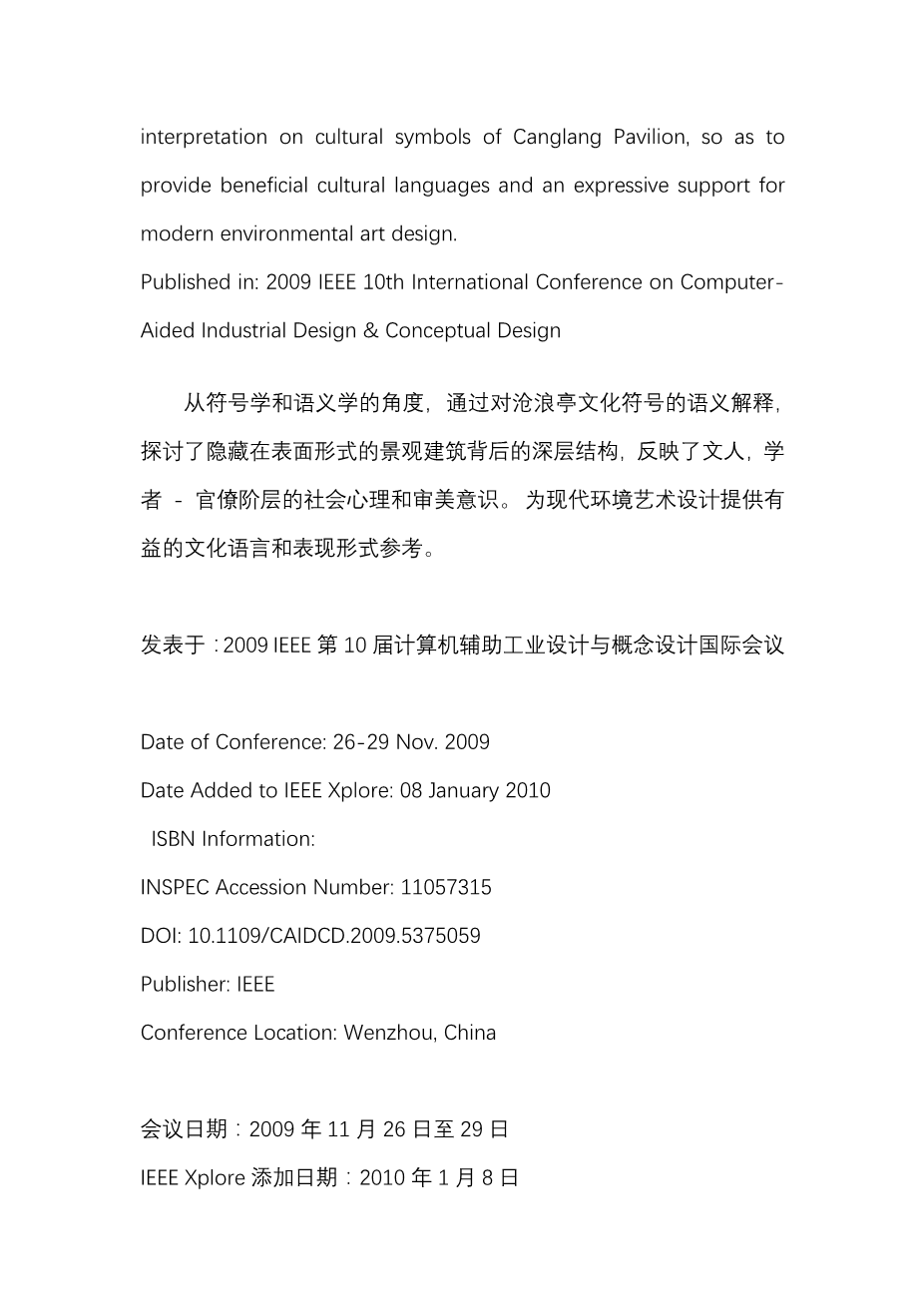 From the perspective of semiotics and semantics, the deep structure hidden behind the superficial form of landscape architecture and the reflected social psychology and aesthetic consciousness of the literati and scholar-bureaucrat class are explored through semantic interpretation on cultural symbols of Canglang Pavilion, so as to provide beneficial cultural languages and an expressive support for modern environmental art design.
