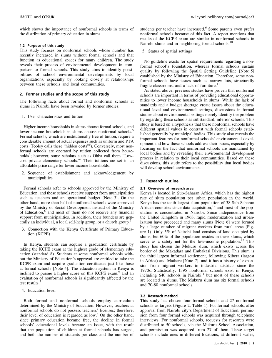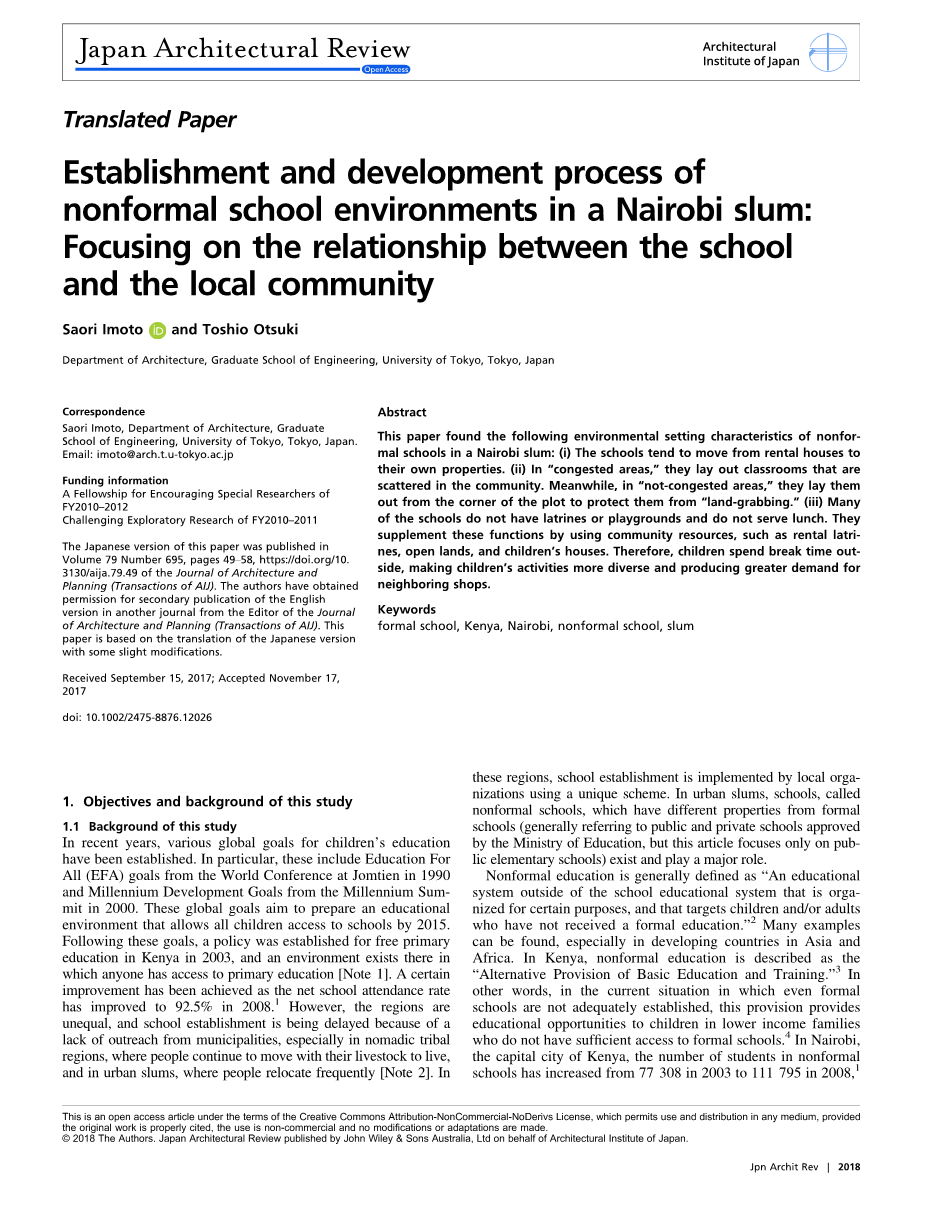 摘要:本文主要研究了内罗毕贫民窟非正式学校的环境设置特征。(1)学校倾向于从出租房屋搬到自己的房产。(2)在“拥挤的地区”,他们布置的教室分散在社区。同时,在“不拥挤的地区”,他们把教室放在地皮的角落,以保护他们不被“掠夺”。(3)许多学校没有厕所或游乐场,也没有午餐供应。它们通过使用社区资源来补充这些职能,如出租厕所、开放土地和儿童住房。因此,孩子们在户外休息,使孩子们的活动更加多样化,此举对邻近的商店产生更大的需求。