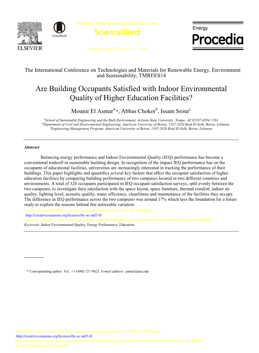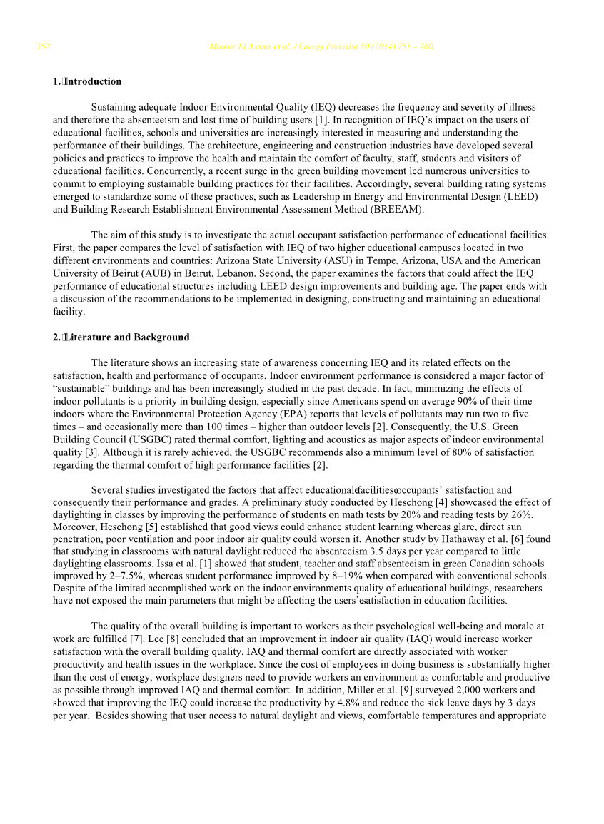 本研究的目的是探讨教育设施的实际使用者的满意度。首先,本文比较了两个不同环境和国家的两个高等教育学校的满意度水平:美国亚利桑那州大学,和美国在黎巴嫩的贝鲁特大学(AUB)。其次,本文研究了影响教育结构的因素,包括LEED设计改进和建筑年龄。文章最后讨论了在设计、建设和维护教育设施方面应实施的建议。