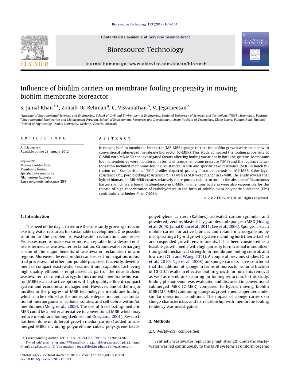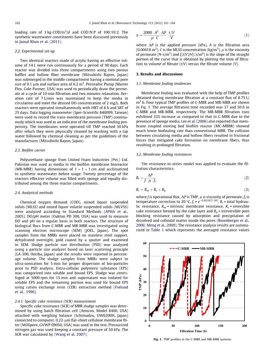 现今的需要是减小现有水资源的日益剧减对可持续发展的压力。解决这一问题的一个可能方法是废水回收和再利用。用于使水更易于接受的最终用途的方法被称为废水回收。地下水回灌是干旱区污水回用的主要效益之一。此外,最终产品可用于灌溉、工业过程和其他非饮用的目的。目前,发展紧凑型废水处理单元,能够实现高品质的污水强调作为分散的废水处理策略的一部分。在这种背景下,膜生物反应器(MBR)是一种极具吸引力的选择,具有高质量的出水、紧凑的系统和经济的管理。然而,MBR技术进展中的主要障碍之一是膜污染,这可以被定义为微生物、胶体、溶质和细胞碎片在膜上的不希望的沉积和积累(Mon等人,2009)。在MBR中使用自由漂浮介质可能是一种更好的替代传统MBR,可以减少膜污染(LekNeES和O.DEGAARD,2001)。研究了不同的生长介质(载体)添加到浸没式MBR中,包括聚氨酯立方体、聚苯乙烯珠、聚乙烯载体(KalDNes)、活性炭(颗粒和粉末)、沸石、爆破粘土颗粒和MBR中的海绵(黄等人,2008;Jamal Khan等人,20)。11;李等人,2006)。海绵作为活性载体的移动载体,并通过结合包括附着和悬浮生长环境的混合生长系统来保持微生物。它已被认为是一种可行的生长介质,具有高孔隙率的微生物固定化,良好的机械强度,膜污染控制,以及低成本(储和王,2011)。在海绵载体上的一些以前的研究(郭等人,2010;NGO等人,2008)已经得出结论,在生物反应器体积分数为10~20%的条件下添加海绵导致生物膜的生长以去除营养物以及减少污垢的膜冲刷。在本研究中,污垢现象被评估和讨论在传统的淹没MBR(C-MBR)相比,混合移动生物膜MBR(MB-MBR)含有海绵作为生长介质在类似的操作条件下操作。研究了海绵载体对污泥特性的影响及其与膜污染倾向的关系。