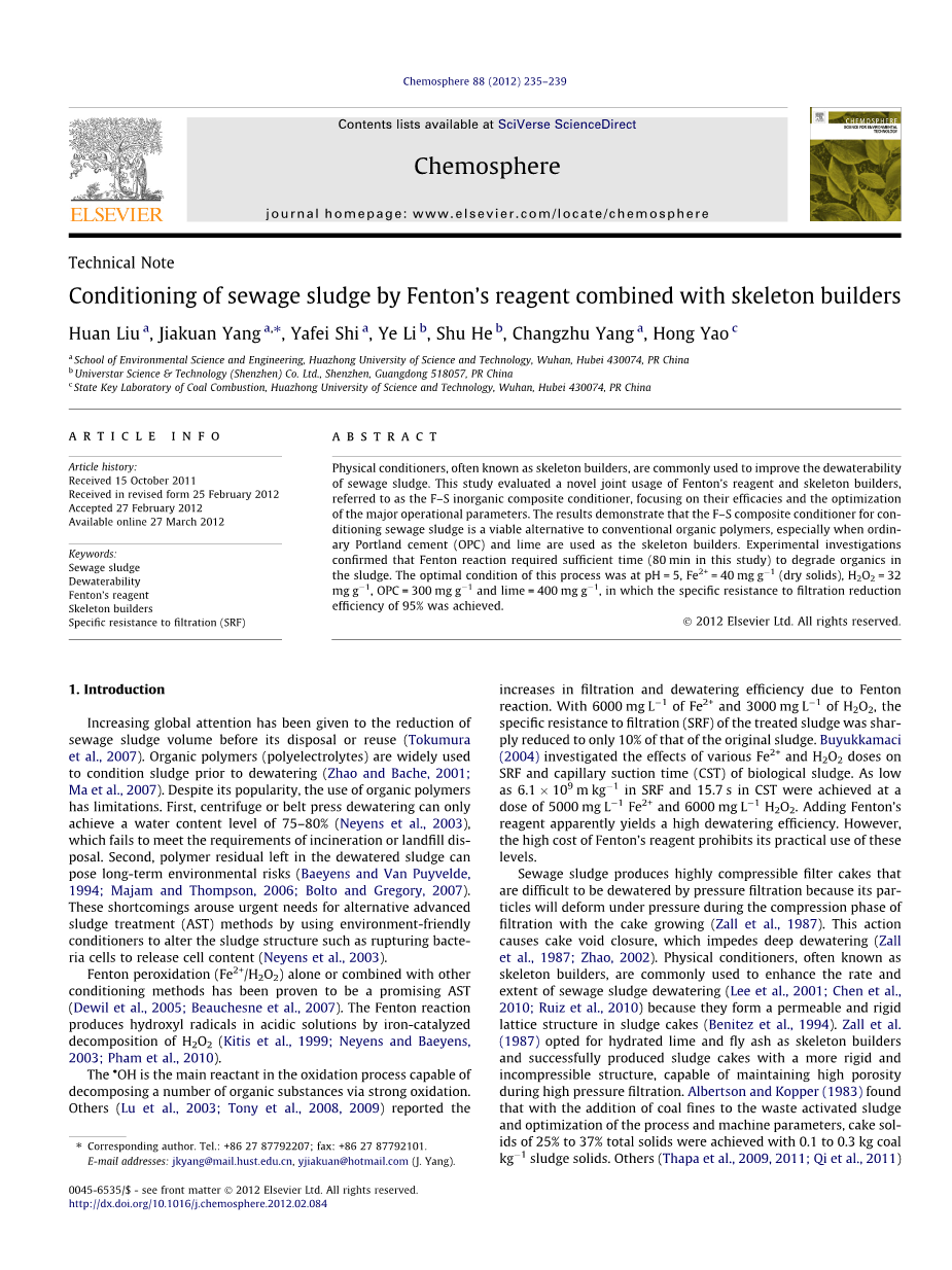 OH是氧化过程中主要的反应物通过强氧化分解许多有机物质。其他人(Lu等人,2003; Tony等人,2008,2009)报道了Fenton提高了渗滤和脱水效率反应。用6000毫克L-1的Fe2 和3000毫克L-1的H2O2,处理污泥的特异性抗过滤能力(SRF)厚度仅减少到原来污泥的10%。 Buyukkamaci(2004)研究了各种Fe2 和H2O2剂量对其的影响生物污泥的SRF和毛细吸入时间(CST),低如6.1
