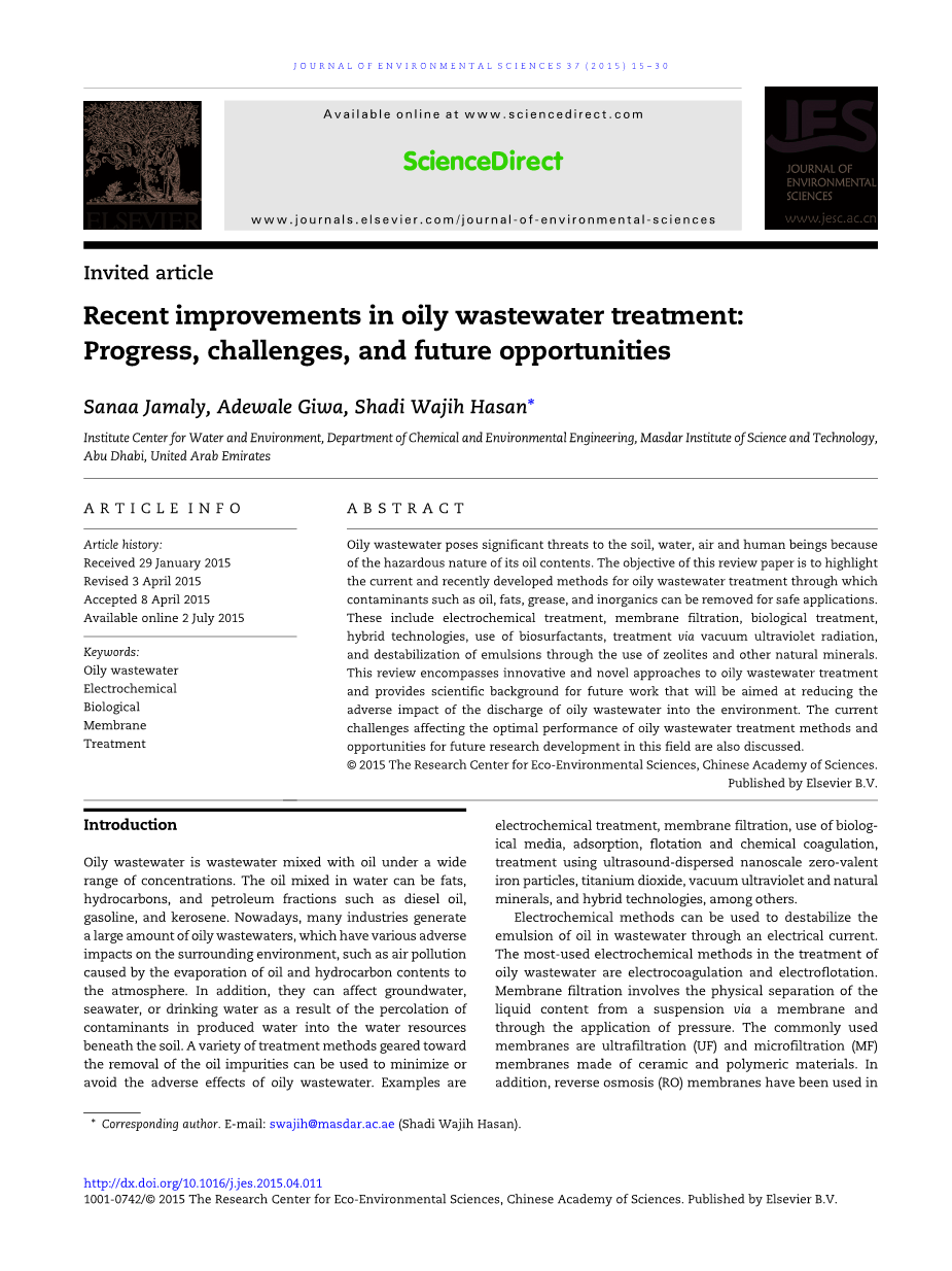 国内和国外研究机构已经在孜孜不倦的深入研究和讨论含油废水的处理方法,目标是去除大量的油,同时考虑到去除溶解性有机物,悬浮固体,油脂,酸碱度,硫化物,氨等(Bjarne,2003;Hayat等,2002)。对于含油废水处理的主要方法所作的一篇详细分析和说明将会在本文讨论。
