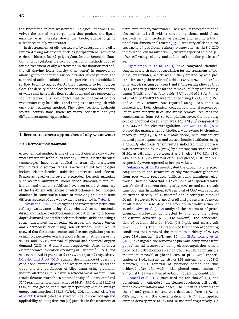 Wang(2007)运用沉淀池模拟和进行沉淀池浮选工艺相结合实验,当进水含油浓度3000-14000mg/L时,平均出水含油浓度300mg/L或者更低,最小浓度达97mg/L,浮选法提升了脱脂效果。Zhu and Zheng(2002)使用剥离浮选法进行炼油厂废水处理,除油率达81.4%,悬浮固体去除率达69.2%。含油废水浮选处理是一项成熟的技术,油和水的分离效果很好且稳定,但缺点是浮渣难处理。Li等。(2007)为了获得油-水分离的高效率,应用溶气气浮和浮选柱结合来进行塔分离系统的含油废水处理。Hamia等在2007年研究了在溶气气浮单元添加活性炭处理的表现。结果表明当碳浓度为50-150mg/L时,COD去除率从16-64%增加到72-92.5%,BOD去除率从27-70%提升到76-94%,BOD和COD处理后数值分别降至45%-95mg/L和110%-200mg/L。(Al-Shamrani等,2002)进行了一项溶气气浮油水分离实验,发现通过絮凝中的硫酸铝预处理,当水中含油浓度为100mg/L时,油基能够通过浮选去除。Painmanakul等。(2010)研究了含有阴离子表面活性剂在临界胶束浓度(CMC)经修改的诱导气浮(MIAF)含油废水的处理过程。研究已经表明在COD方面的去除效率,与投药量,PH值和气体流速有关。此外,界面面积得到来自于气泡水力参数(气泡尺寸,气泡上升速率,气泡形成频率)的实验证明以及速度梯度被证明是控制浮选效率和运营成本的重要参数。在本次研究中,基于a/G比率提出的简单相关性,提供了在实验性和处理效率的预测价值方面一个相对较好的一致性。表格1描述了浮选法处理含油废水。