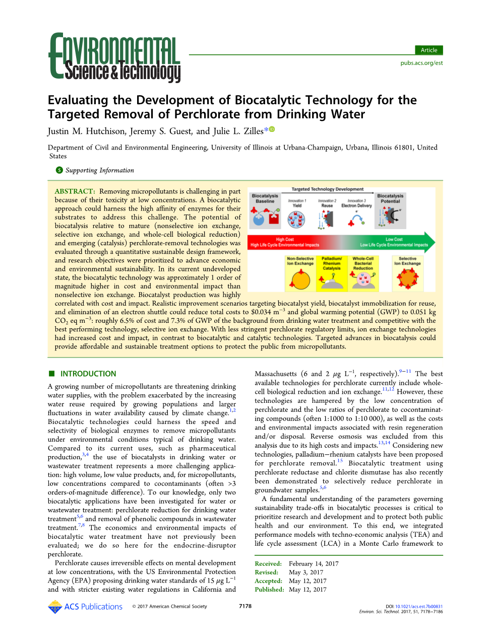 越来越多的微污染物正在威胁饮用水,供水问题日益严重,日益增长的人口需要越来越多的水回用以及气候变化引起的水资源供应问题。1,2 生物催化技术可以利用生物酶的速度和选择性去除典型饮用水环境条件下的微污染物。 与其目前的用途相比,如药品生产,3,4 生物催化剂在饮用水或废水处理中的使用代表了更具挑战性的应用:高容量,低价值的产品,以及对于微污染物而言,与混合污染物相比,其浓度低(通常大于3个数量级)。 据我们所知,只有两种生物催化剂用于水或废水处理:降低高氯酸盐用于饮用水处理5,6 并在废水处理中去除酚类化合物。7,8 以前没有评估生物催化水处理的经济和环境影响; 我们这里是为了内分泌干扰物高氯酸盐而做的。