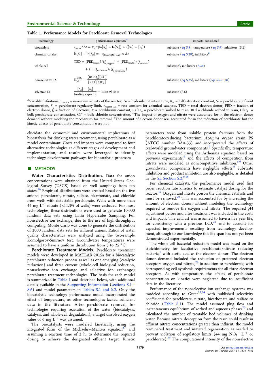 高氯酸盐处理模型。 在MATLAB 2015a中开发了高氯酸盐处理模型,用于生物催化高氯酸盐还原过程以及一种新兴(催化还原)和三种当前(全细胞生物还原,非选择性离子交换和选择性离子交换)高氯酸盐处理技术。 每个模型的基础总结在表格1并在下面描述,其他详细信息请参阅支持信息(第S.1- S.6)和模型参数表S.1和S.2。 只有生物催化技术性能模型结合了温度效应,因为其他技术在文献中缺乏足够的数据。 除去高氯酸盐后,对于需要水再生的技术(生物催化,催化和全细胞降解),目标溶解氧值为6 mg L/。