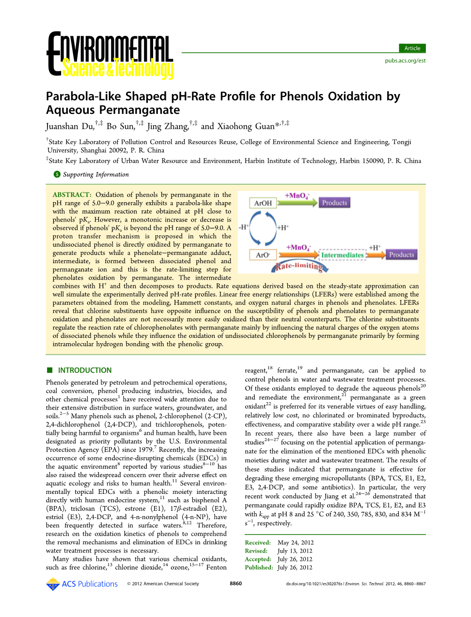 然而,一些关于高锰酸盐氧化的研究结果与酸碱模型(e)的动力学不一致Demerol和Tranny36 结果表明,八种取代苯酚高锰酸盐氧化的表观速率常数与pH值不符合简单的酸碱形态模型。 江等人24 也报道了高锰酸盐氧化2,4-DCP和TCS的速率常数随着pH值的增加而增加,最大pH值为8.0,随着pH的升高而降低。结果表明,高锰酸盐对几种酚类化合物的氧化动力学不能用简单的酸碱形态模型模拟。26 这些作者无法很好地解释这些现象,需要进一步的研究来了解高锰酸盐氧化酚类化合物的机理。