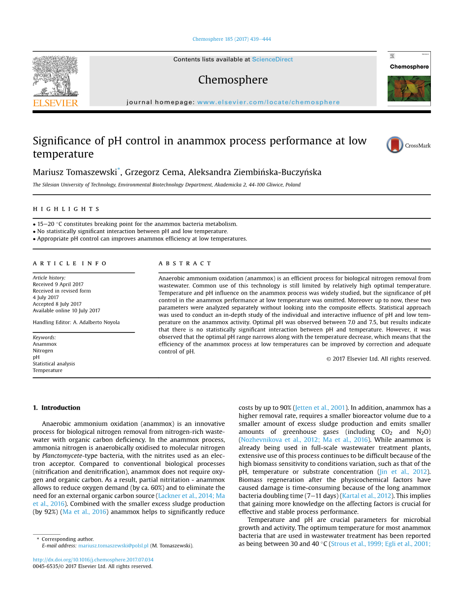 厌氧氨氧化是废水生物脱氮的有效工艺,相对较高的最佳温度限制这种技术的普遍使用。对厌氧氨氧化工艺的温度和pH影响进行了广泛的研究,但是在低温厌氧氨氧化工艺中pH值控制的重要性被忽略了。此外,到目前为止,这两个参数分别进行了分析,没有考虑复合效应。使用统计学方法深入研究pH和低温对厌氧氨氧化活性的影响。最佳pH范围是7.0-7.5,但结果表明在pH和温度之间没有明显的相互作用。然而,观察到最佳pH范围随着温度降低而变窄,这意味着通过校正和适当控制pH可以提高厌氧氨氧化工艺在低温下的效率。