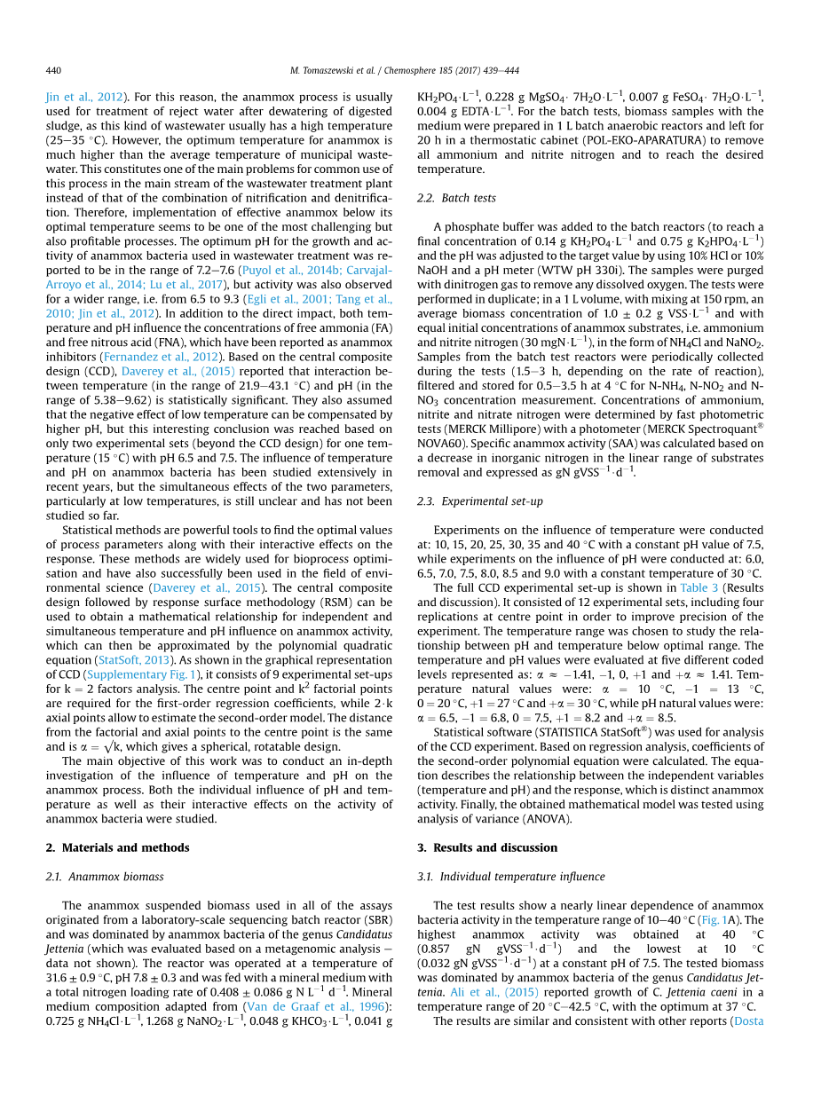到了相似的结果。Sobotka等(2015)也使用在30℃培养的颗粒状生物质,在他们的实验中,在相同温度范围(10-40℃)的温度依赖性几乎是线性,即从0到1.3gN gVSS-1· d-1。最近的另一份报告中,Lotti等(2015)在30℃的生物质条件下,在20℃培养8个月后和10℃下培养6个月后,在适应寒冷条件过程中进行温度效应的评估(10至30℃)。这项有趣的研究证明,在20℃和10℃长期培养后,厌氧氨氧化细菌能够适应较低的温度,并且适应的生物量在低温下具有比未适应的生物量更高的SAA。适应是细菌中的一种自然现象,厌氧氨氧化细菌的对温度适应已经被许多作者研究和证实((Dosta et al., 2008; Isakaet al., 2008; Lotti et al., 2015)。