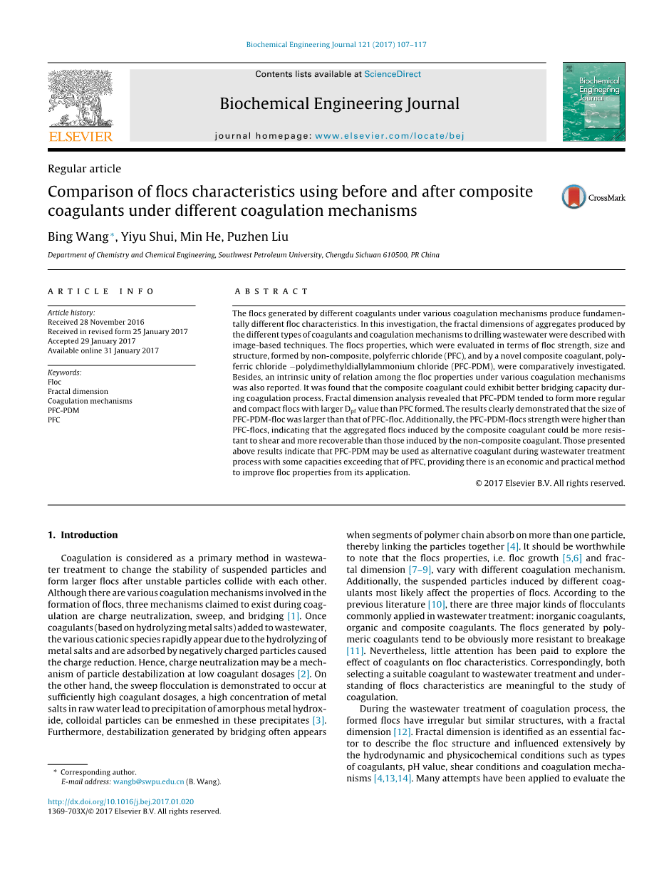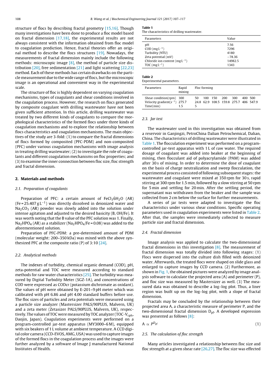 絮凝体的结构很大程度取决于不同的混凝机理、混凝剂类型和混凝过程涉及的剪切条件。然而,对通过复合混凝剂处理钻井废水产生的絮凝体的研究目前为止还没有得到足够的重视。在本文中,钻井废水分别用两种不同的混凝剂处理,然后来比较三种混凝机理下的絮凝体形态特征并且探讨絮凝体的特性和混凝机理之间的关系。该研究的主要目标有三个:(1)利用图像分析比较各种混凝机理下处理钻井废水中由复合混凝剂(PFC-PDM)和非复合混凝剂(PFC)形成的絮凝体的分形维数;(2)研究混凝剂和不同混凝机理对絮凝体性能的影响;(3)检测絮凝体大小,絮状物强度之间的内在联系和分形维数。