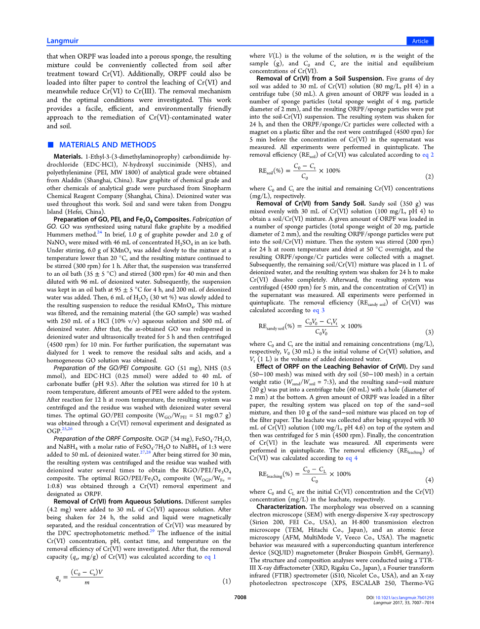 氧化石墨烯(GO),二维碳纳米材料,具有超大的比表面积和丰富的含氧基团(例如,minus;OH和minus;COOH)已被用作一种高效的吸附剂去除重金属离子[21-23]。聚乙烯亚胺(PEI)可以通过酰胺化反应引入大量的minus;NH2基团,对Cr(VI)的去除能力有效的提高[4]。虽然GO/PEI对Cr(VI)具有很高的吸附和还原能力,但Cr(VI)处理后,这种混合物不易从水和土壤中收集起来。在此,Fe3O4结合GO/PEI获得RGO/PEI/Fe3O4(最优的被称为ORPF),这显示高去除Cr(VI)能力体现在水溶液中吸附、还原和优良的磁性可回收性。值得注意的是,当在多孔海绵中加入ORPF时,所得混合物可方便地从土壤中处理Cr(VI)。此外,ORPF也可以装入滤纸控制Cr(VI)的浸出同时还原Cr(VI)为Cr(III)。对其去除机理和最佳条件进行了研究。这项研究提供了一种简便、有效且环境友好的方法来修复Cr(VI)污染的水和土壤。