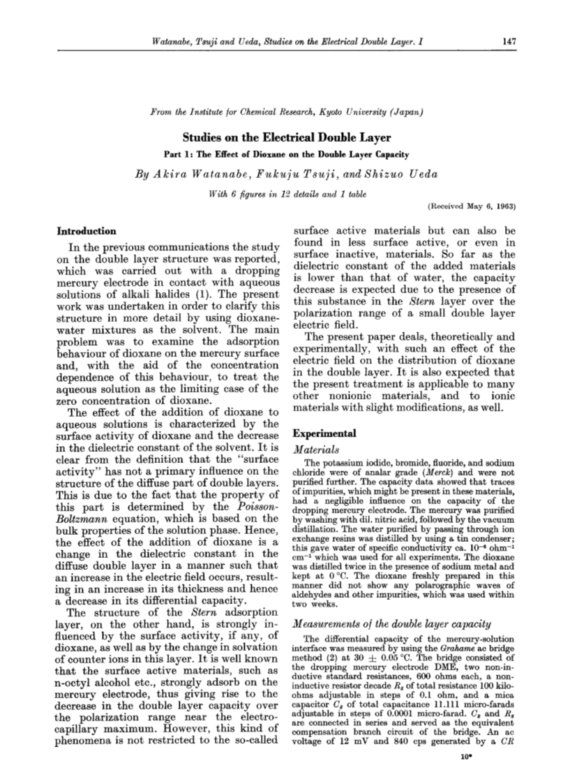 在以前的通信中,报道了双层结构的研究,该研究使用与碱金属卤化物水溶液接触的滴汞电极(1)进行。 目前的工作是为了通过使用二恶烷水混合物作为溶剂更详细地阐明该结构。 主要问题是检查二氧六环在汞表面上的吸附行为,并且借助于这种行为的浓度依赖性,将水溶液作为二氧杂环己烷零浓度的限制情况处理。
