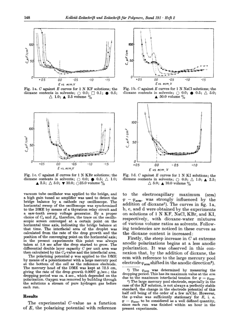 作为E的函数的实验0值,参考极化电位至电毛细管最大(ecm)(fJ - ffJecm,受二恶英添加量1的强烈影响)。 图中的曲线。 通过对各种体积比的二恶烷 - 水混合物作为溶剂,分别用1N KF,NaCl,KBr和KI的溶液进行实验获得1a,b,c和d。 随着二恶烷的含量增加,在这些曲线中注意到趋势: