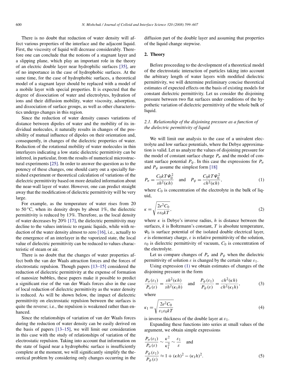 因此,人们可以很容易地看到,分离的压力恒定电荷模型线性取决于减少介电常数的液体。因为在ε1lt;ε是相反的双层厚度满足不等式kappa;1gt;kappa;也可以从表达式(5)中清楚地看出恒定电位模型的分离压力也下降,但是比恒定电荷模型的情况慢。