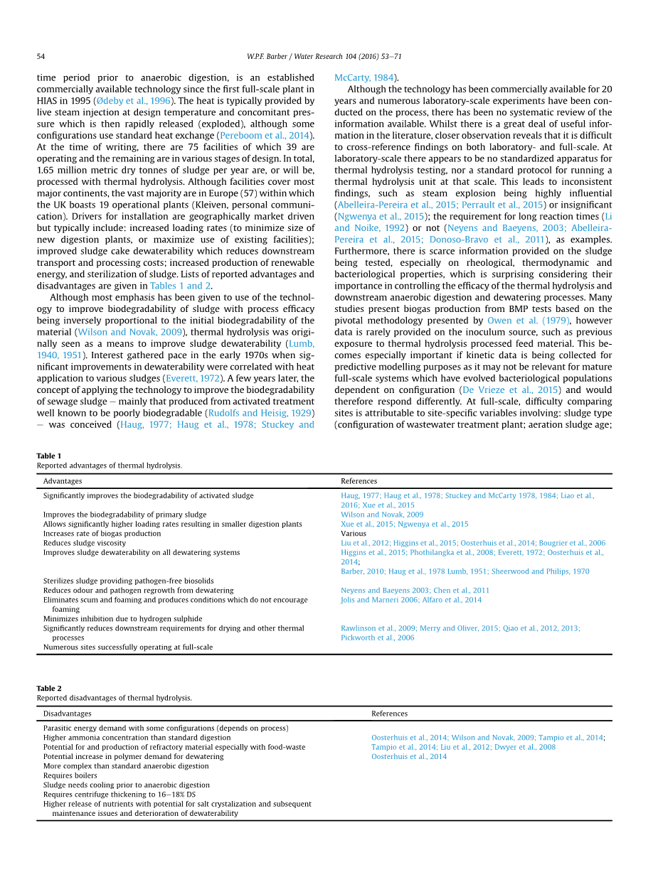 尽管这项技术已经商业化了20年,并且已经进行了大量实验室规模的实验,但是还没有对现有信息进行系统的审查。虽然文献中有大量有用的信息,但仔细观察发现,很难在实验室和全面的研究中进行交叉参照。在实验室规模,似乎没有一个标准化的设备进行热水解测试,也没有一个标准的协议运行的热水解单位在那个规模。这导致了不一致的发现,如蒸汽爆炸是重要的或无关紧要的;是否需要长反应时间。此外,关于被测试污泥的资料很少,特别是关于流变性、热力学和细菌性质的资料,考虑到它们在控制热水解和下游厌氧消化和脱水过程的有效性方面的重要性,这是令人遗憾的。许多研究基于Owen等人(1979)提出的关键方法,通过BMP测试来生产沼气,但是很少提供关于接种源的数据,例如之前接触过热水解加工饲料材料。如果为预测建模目的而收集动力学数据,这一点就变得尤为重要,因为它可能与成熟的全尺寸系统无关,后者已经根据构型进化出了细菌种群,因此会有不同的反应。在规模上,比较场地的困难是由于场地特定的变量,涉及:污泥类型(污水处理厂的配置;曝气污泥龄;工业负荷);厌氧消化(配置、停留时间、操作温度、数量、混合类型);热电联产(配置,规模和效率)等。尽管存在这些问题,文献提供了关于基于热水解使用的预期趋势和潜在性能预期的有价值的信息,表3总结了这些信息。