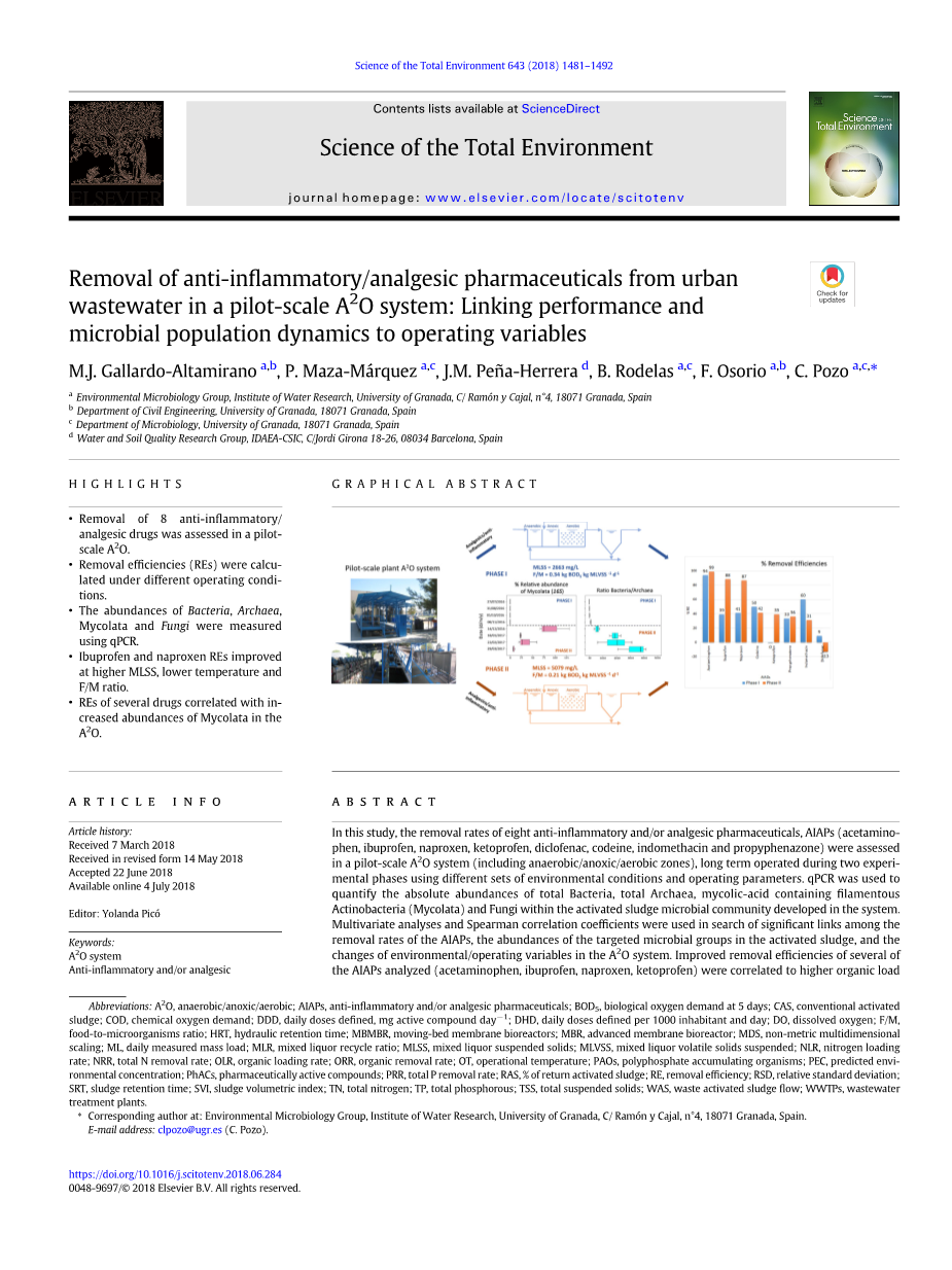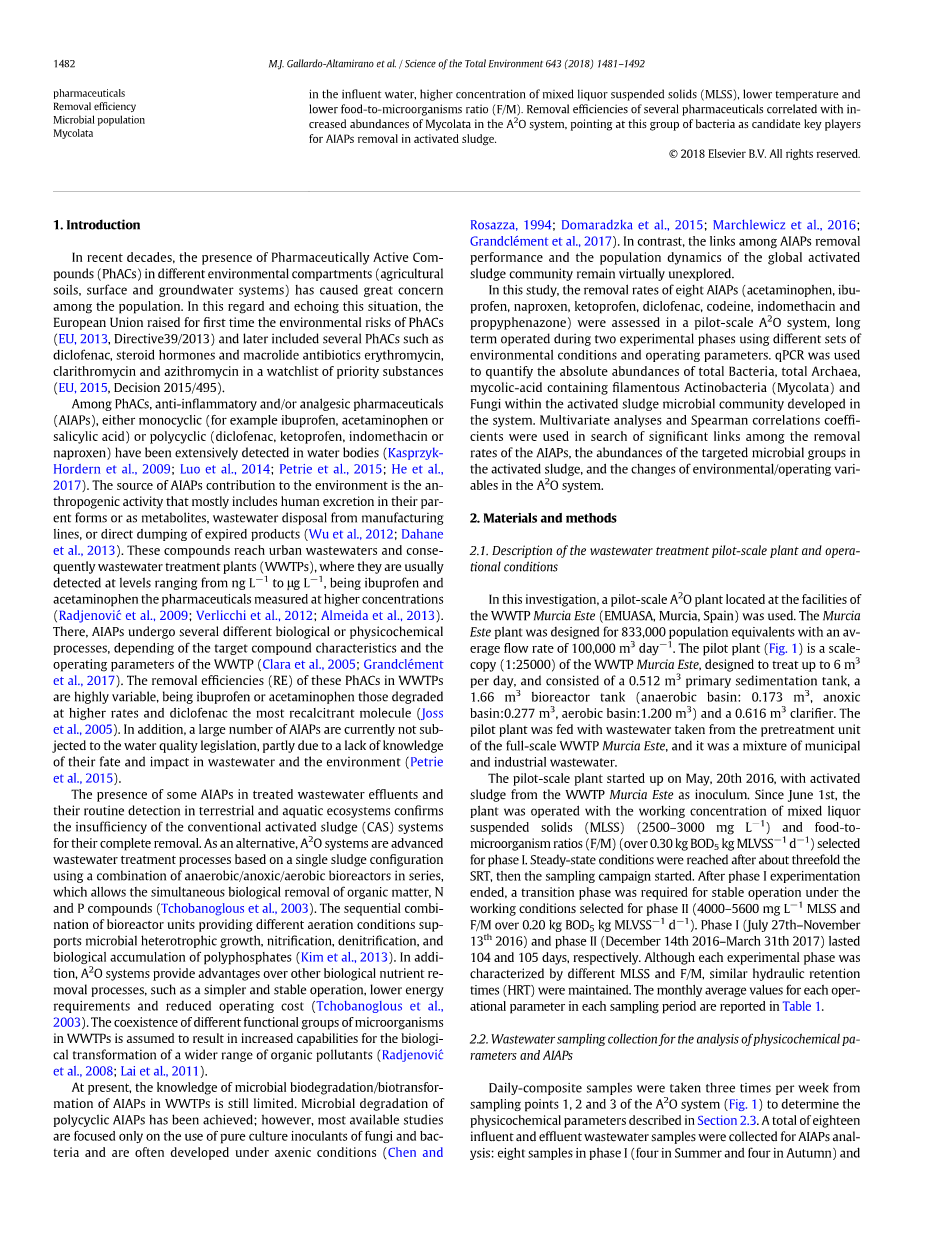 在PhAC中,已在水体中广泛检测到单环类(例如布洛芬,对乙酰氨 基酚或水杨酸)或多环类(双氯芬酸,酮洛芬,吲哚美辛或萘普生)的抗炎和/或镇痛药物(AIAP)(Kasprzyk- Hordern et all,2009; luo et all,2014; Petrie et all,2015; He et all 2017).AIAPs对环境的贡献的来源是人为活动,主要包括人类以母体形式或代谢产物形式排泄,生产线 废水处理或直接倾倒过期产品(Wu等,2012; Dahane 等,2013).这些化合物到达城市废水中,进而到达废水处理厂(WWTPs)中,通常在ng Lminus;1 至mu;gLminus;1范围内被检测到,它们是布洛芬和对乙酰氨基酚,药物的浓度较高(Radjenović等人,2009年; Verlicchi等人, 2012年; Almeida等人,2013年).那里的AIAP经历了几种不同的生物或物理化学过程,具体取决于目标化合物的特性和污水处理厂的运行参数 (Clara等人,2005年; Grandclement 等,2017).废水处理厂中这些PhAC的去除效率(RE)变化很大,其中布洛芬或对乙酰氨基酚的降解率较高,而双氯芬酸是最难降解的分子(Joss等,2005).此外,目前许多AIAP均未受到水质法规的约束,部分原因是对其命运以及对废水和环境的影响缺乏了解(Petrie等,2015). 在处理过的废水中存在一些AIAPs,并在陆地和水生生态系统中进行了常规检测,这证实了常规活性污泥(CAS)系统无法完全清除。作为替代方案,Asup2;O系统是基于单个污泥配置的先进废水处理工艺,使用串联的厌氧/厌氧/好氧生物反应器组合,可以同时生物去除有机物,N和P化合物(Tchobanoglous等,2003).提供不同曝气条件的生物反应器单元的顺序组合可支持微生物异养生长,硝化,反硝化和多磷酸盐的生物积累(Kim等,2013).此外,Asup2;O系统具有比其他生物养分去除工艺更优越的优势,例如操作更简单,稳定,能耗更低 , 运行成本更低 (Tchobanoglous等, 2003).假定污水厂中微生物不同功能种群的存在会导致更广泛的有机污染物的生物转换能力加强。(Radjenovic 等,2008; Lai等,2011).