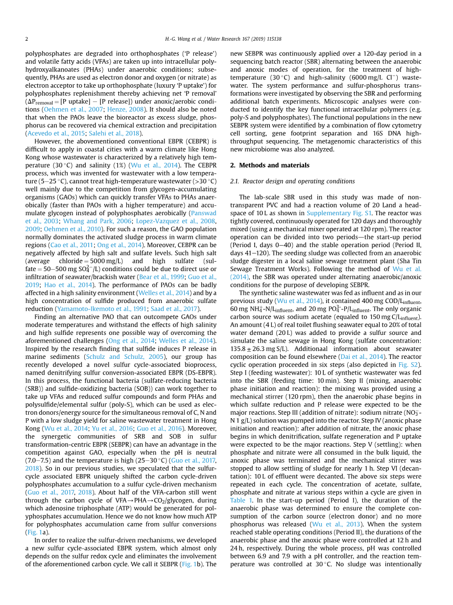为了认识硫驱动的机制,我们开发了一种新型的硫循环相关的EBPR体系,它几乎可以只依赖于硫的氧化还原循环并消除前述碳循环的影响。我们称它为SEBPR(图. 1b)。新型SEBPR于一个在厌氧和缺氧模式的工况下交替运作的序批式反应器(SBR)中持续运行了120天,其目的是处理高温(30℃)和高盐度(6000mg/L Cl-)的废水。通过观测SBR和进行附加批次试验,我们发现了这个体系的性能和硫-磷之间的转化现象。通过微观分析,我们发现了关键的功能性胞内聚合物(比如聚硫和聚磷酸盐)。这种SEBPR中的功能群体是通过结合流动式细胞光度法细胞分选,基因空间分离和16S DNA高通量测序的技术被发现的。这种新型微生物群落的宏基因租特性也被分析出来了。