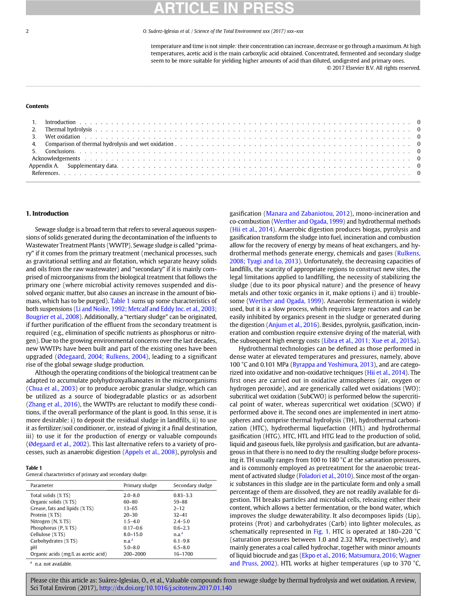 是一个广义的术语,是指在污水处理厂(WWTP)的进水净化过程中产生的几种含水悬浮物。污水污泥被称为“主”如果它来自一级处理(机械过程,如重力沉降和空气浮选,从原始的单独的沉重的固体颗粒和油废水)和“二级”如果它主要是由微生物的生物处理,主要的一个(微生物活动去除悬浮和溶解的有机物,但也导致增加生物量的数量,必须清除)。表1总结了两种悬架的一些特征(Li和Noike, 1992;Metcalf和Eddy Inc.等,2003;Bougrier等人,2008年)。此外,如果需要对二级处理的出水进行进一步净化(例如,消除磷或氮等特定营养物质),则可以产生“三级污泥”。由于日益增长的环境问题在过去几十年里,新WWTPs建造和现有的已经升级的一部分(Oslash;degaard, 2004;Rulkens, 2004),导致了全球污泥产量的显著上升。虽然生物处理的操作条件可以适应积累s(蔡et al ., 2003)或微生物好氧颗粒污泥产生,可以利用生物可降解塑料的来源或吸附剂(Zhang et al ., 2016), WWTPs不愿意修改这些条件,如果工厂的整体性能很好。从这个意义上说,它是更可取的:我在垃圾填埋场)存放剩余污泥,ii)使用它作为肥料/土壤改良剂,或者,给它一个最终的目的地,而是iii)用它来生产能源或有价值的化合物(Oslash;degaard et al ., 2002)。最后一种方法涉及多种工艺,如厌氧消化(Appels et al., 2008)、热解和气化(Manara和Zabaniotou, 2012)、单焚烧和共燃烧(Werther和Ogada, 1999)和水热法(Hii等,2014)。厌氧消化产生沼气,热解和气化将污泥转化为燃料,焚烧和燃烧允许通过热交换器回收能量,水热方法产生能源、化学品和气体(Rulkens, 2008;Tyagi和Lo, 2013)。垃圾填埋场的能力下降,不幸的是,缺乏适当的地区建立新的网站,应用填埋的垃圾的法律限制,稳定污泥的必要性(由于其物理性质不良)和重金属和其他有毒有机物的存在,使选项1)和2)麻烦(维特和Ogada, 1999)。厌氧发酵应用广泛,但它是一个缓慢的过程,需要大型反应器,容易被污泥中存在的有机物或消化过程中产生的有机物所抑制(Anjum et al., 2016)。此外,热解、气化、焚烧和燃烧需要大量的干燥材料,随之而来的是较高的能源成本(Libra et al., 2011;薛等,2015a)。水热技术可以定义为在较高温度和压力下,即高于100°C和0.101 MPa的高密度水中进行的技术(Byrappa和Yoshimura, 2013),分为氧化技术和非氧化技术(Hii et al., 2014)。第一种是在氧化气氛(空气、氧气或过氧化氢)中进行的,通常称为湿氧化(WO):亚临界湿氧化(SubCWO)是在水的超临界点以下进行的,而超临界湿氧化(SCWO)是在水的超临界点以上进行的。第二种是在惰性气氛下进行的,包括热水解(TH)、水热炭化(HTC)、水热液化(HTL)和水热气化(HTG)。HTC、HTL和HTG可以生产固体、液体和气体燃料,如热解和气化,但其优势在于在处理前不需要干燥产生的污泥。TH在饱和压力下的温度范围为100 ~ 180℃,通常作为活性污泥厌氧处理的预处理(Foladori et al., 2010)。由于污泥中的大部分有机物以颗粒形式存在,只有一小部分被溶解,它们不容易被消化。TH打破颗粒和微生物细胞,释放其含量,使发酵更好,或结合水,提高污泥的脱水能力。它还将脂类(Lip)、蛋白质(Prot)和碳水化合物(Carb)分解成较轻的分子,如图1所示。HTC的操作温度为180-220°C(饱和压力分别介于1.0 - 2.32 MPa),主要生成一种称为氢焦的煤,以及少量的液体生物原油和气体(Ekpo等,2016;Matsumura, 2016;瓦格纳和普鲁斯,2002年)。HTL工作在更高的温度(高达370°C,