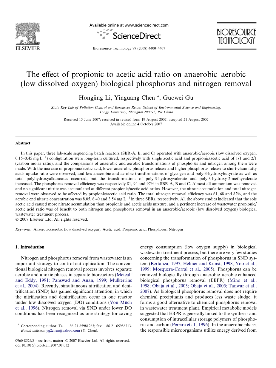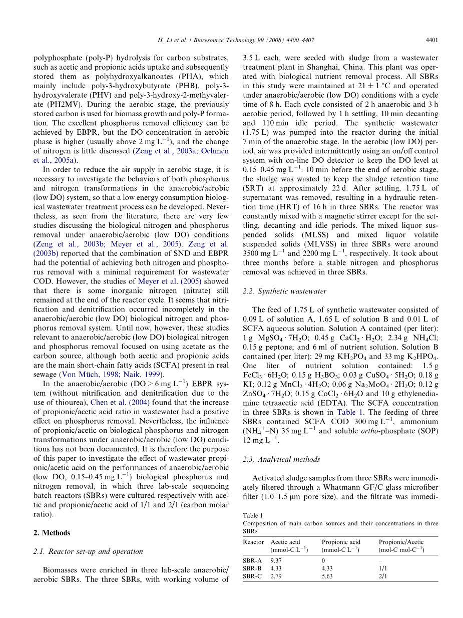在厌氧/好氧(DOgt;6mg/L)EBPR系统(由于使用硫脲而没有硝化反硝化作用)中,Chen等人发现增加污水中丙酸乙酸的比率对磷的去除有积极作用。然而,丙酸乙酸比对厌氧/低氧情况下生物氮磷转化的影响还没有被证明。因此这就是本文探讨污水中丙酸乙酸比对厌氧/低氧(DO,0.15—0.45mg/L)生物脱氮除磷效率的影响的目的。在实验中,三个分别采用乙酸、丙乙酸比为1/1和2/1(碳摩尔比)的实验室规模的序批式反应器被分别培养。