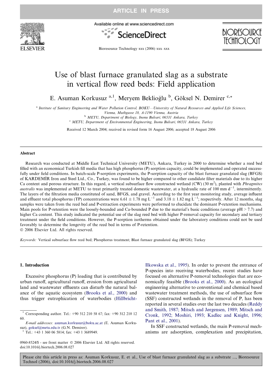 在2000年,位于土耳其安卡拉的中东技术大学主导了一项研究,该研究用以确定,是否填有高吸收磷(P)能力的土耳其经济型填充介质的秸秆滤床能够在野外环境中良好地运行。在一系列的磷吸收实验中,由于KARDEMIR钢铁公司的高炉熔渣(BFGS)有更高的钙含量和多孔结构,因此与其他对照过滤材料相比,KARDEMIR钢铁公司的高炉熔渣被发现具有更高的磷吸收能力。正因如此,在中东技术大学,种有芦苇的垂直流人工湿地(30m2)主要用来处理生活污水,水流速率为100mm2/d,不连续进水。这种过滤介质层由沙子、高炉熔渣和砾石组成。根据第一年的检测研究,流入总磷和流出总磷的浓度分别为和。12个月后,从芦苇滤床取出的熔渣样本和磷产量实验都阐明了这种具有主导地位的磷吸附机理。由于该物质的基本条件(平均pH>7.7)和更高的钙含量,主要聚集的磷是游离磷和钙磷化合物。这项研究表明,在野外环境下,具有高去除磷能力的熔渣秸秆滤床应用于二级和三级处理中的潜在可能性。然而,就磷吸附而言,这种在实验条件下的磷吸附等值线还不能够顺利地用来决定芦苇滤床的寿命。