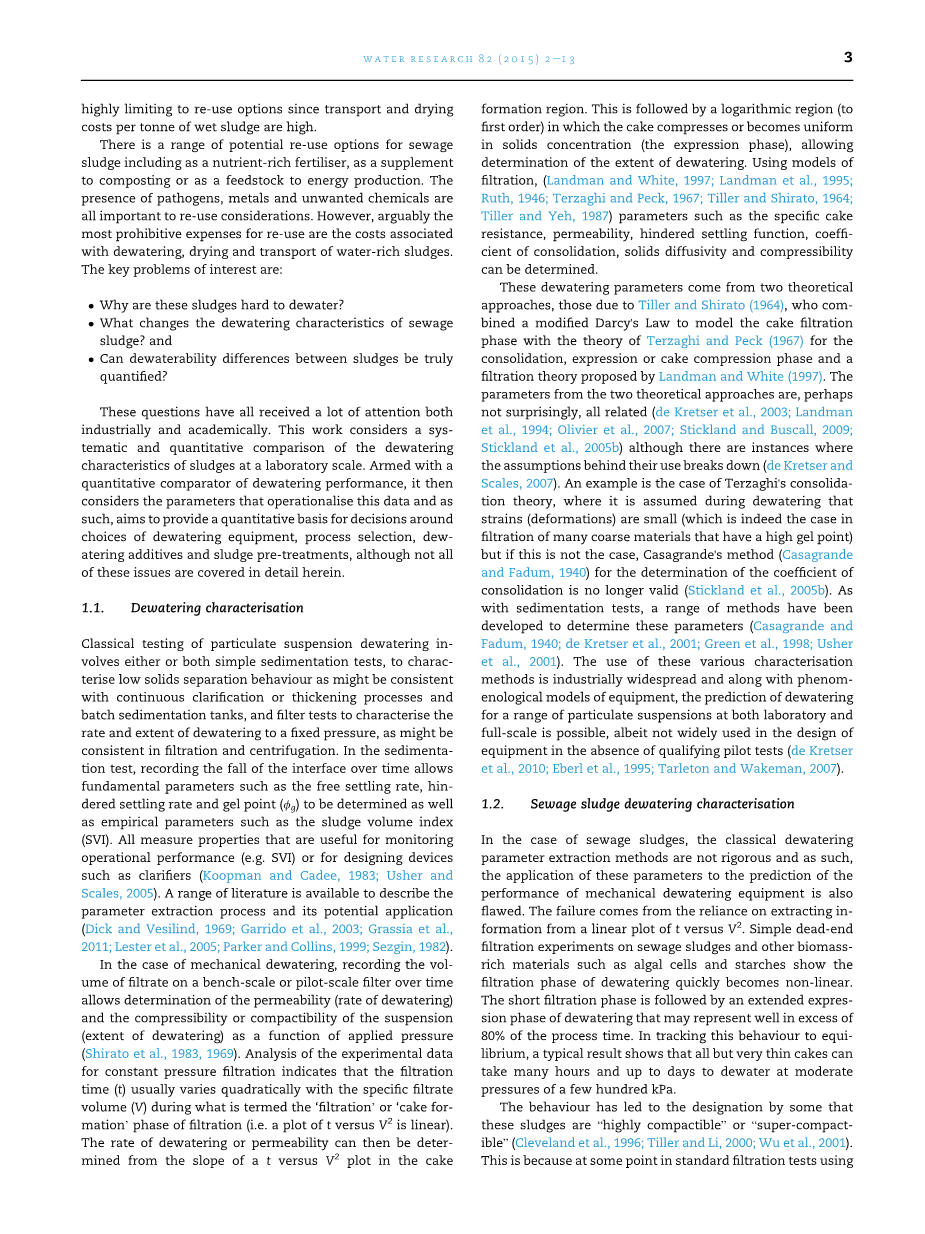 这些脱水参数来自两个理论方法,都来自结合修改了达西定律的滤饼过滤相太沙基和派克(1967)为巩固,表达或滤饼压缩阶段的理论模型和兰德曼和怀特(1997)提出的渗流理论的分蘖和白土(1964年)。从两种理论方法得来的参数都相关,这也许并不奇怪,(德克雷特瑟等人,2003;兰德曼等人,1994;奥利弗等人,2007; Stickland和Buscall,2009; Stickland等人,2005年b)虽然存在打破它们背后假设的实例(德克雷特瑟和斯科尔斯,2007年)。一个例子是太沙基固结理论,它是脱水该株(变形)小(这确实是在具有高的凝胶点许多粗料的过滤的情况下)中假设的情况,但如果不是这种情况下,卡萨格兰德的方法(卡萨格兰德和费德姆,1940年)整顿系数的确定不再有效(Stickland等人,2005年b)。在沉淀的测试中,一些理论研究已被开展来确定这些参数(卡萨格兰德和费德姆,1940年;德克雷特瑟等人,2001; Green等,1998;亚瑟等人,2001)。这些不同的表征方法的使用与设备的唯象模型一起,在工业上广泛扩展,脱水在实验室和满量程的范围内的微粒悬浮液的预测是可能的,尽管没有被广泛使用在设备的设计没有资格试验测试(EBERL等人,1995年,塔尔顿和魏斐德,2007年)。