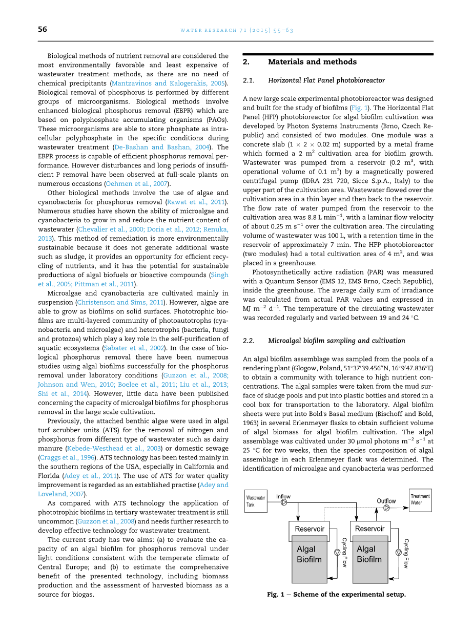 当前的研究有两个目的:(a)在符合欧洲中部温带气候条件的光照条件下评估微藻生物膜除磷能力;(b)评估所提出的技术的综合效益,其中包括对生物质能的生产的评定以及对作为沼气源的生物产量的评定。