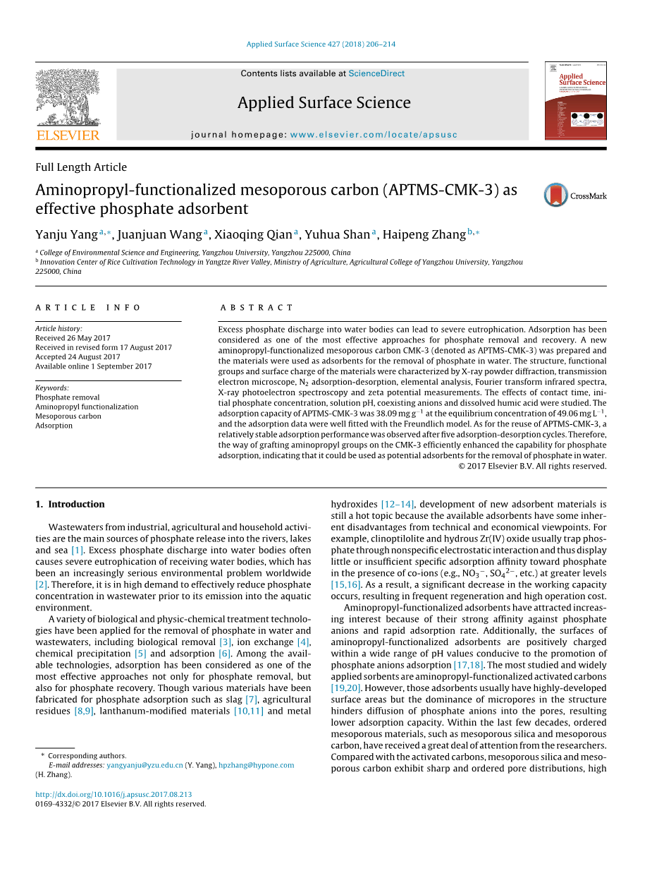 氨丙基功能化介孔碳(APTMS-CMK-3) 作为有效磷吸附剂的研究外文翻译资料