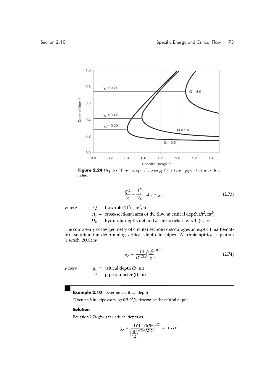 通常,对于给定的流量,存在两个深度能够满足公式2.76,这些深度出现在水跃前后,被称为跃迁水深或共轭水深。