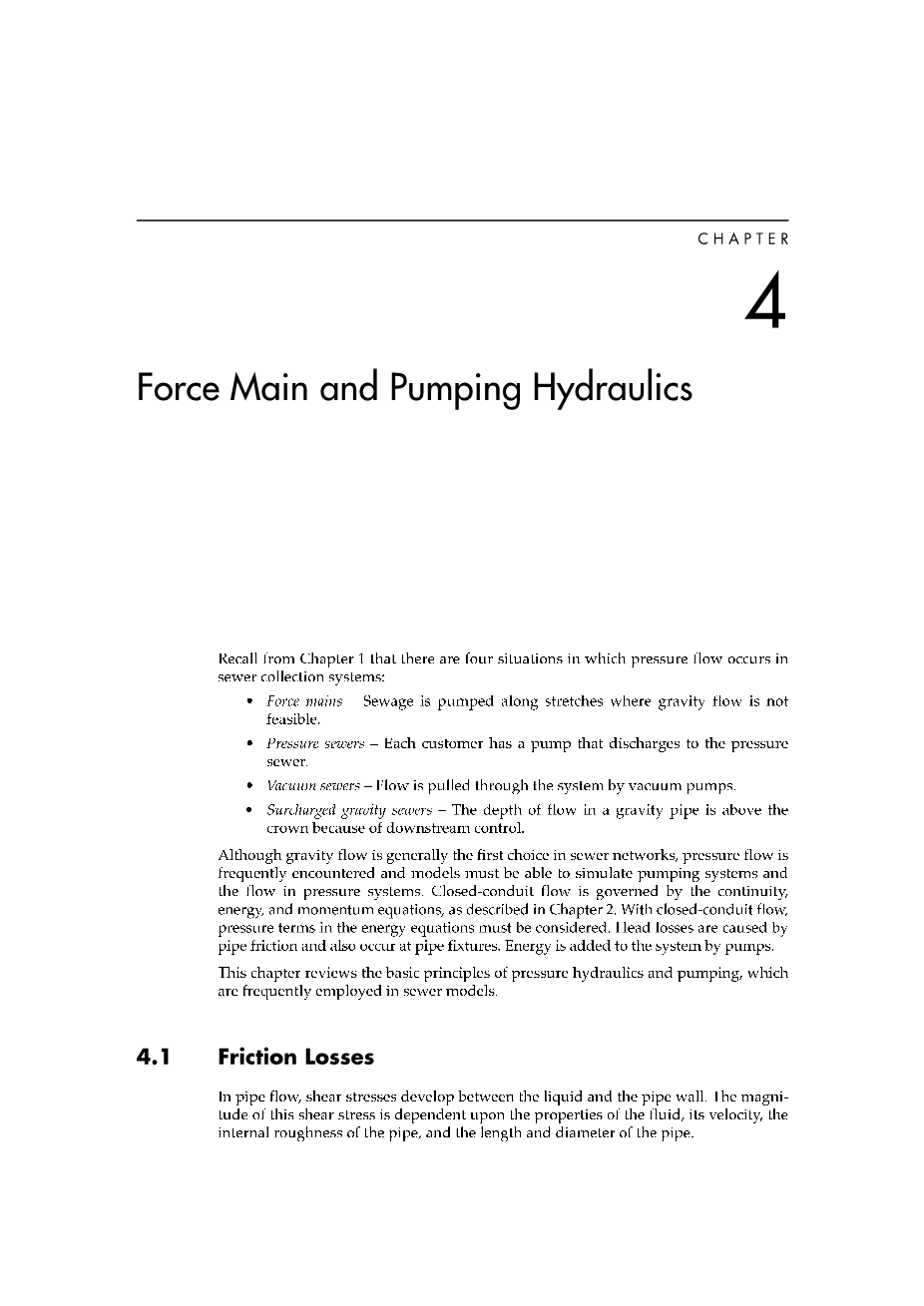尽管重力流通常是污水管网中的首选,但压力流是经常遇到的,模型必须能够模拟抽水系统和压力系统中的流量。克莱如第2章所述,开口管道流受连续性、能量和动量方程的控制.对于封闭管道流动,必须考虑能量方程中的压力项.头洛SSE是由管道摩擦引起的,也发生在管件上。能量是通过泵增加到系统中的。