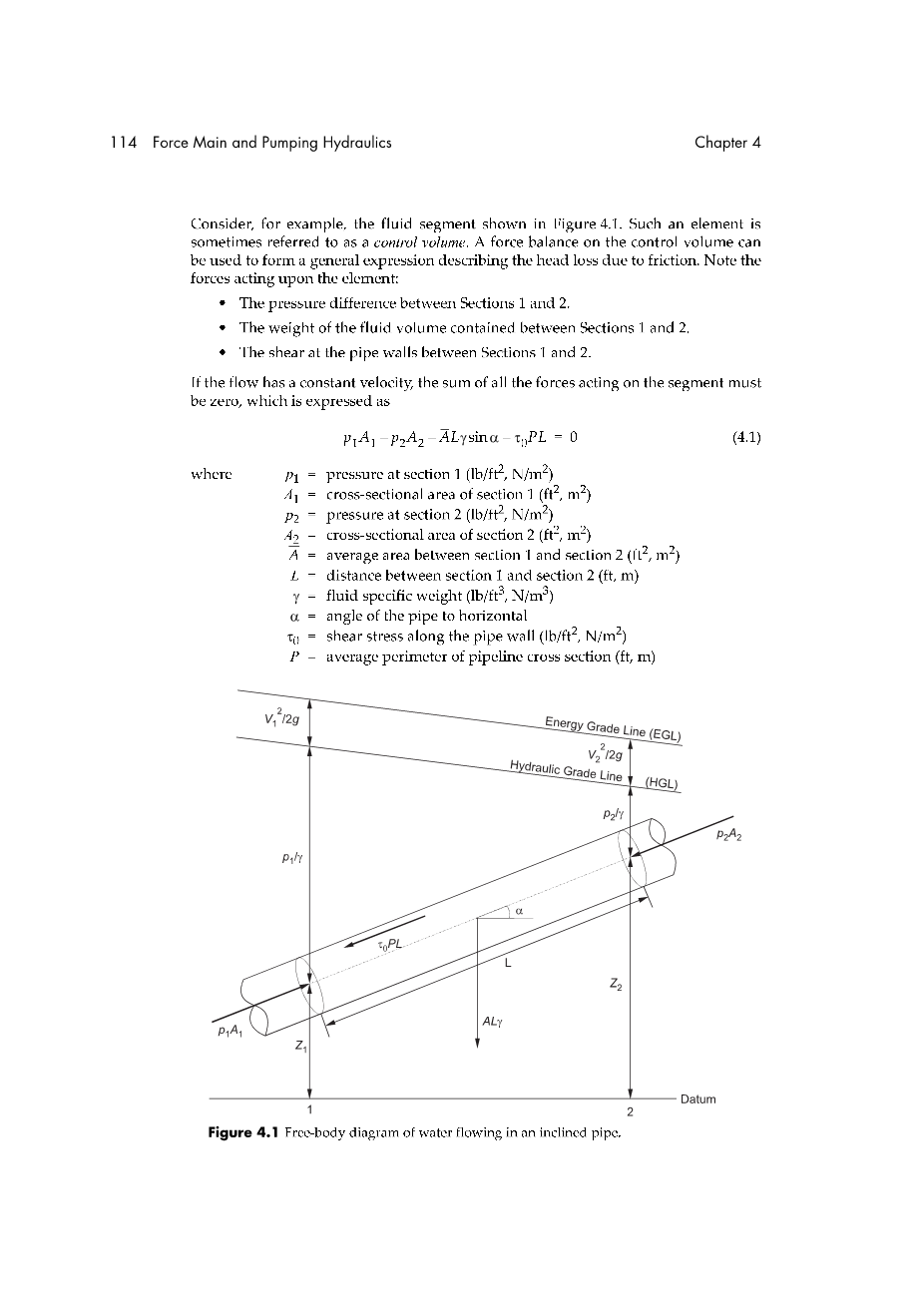 例如,考虑如图4.1所示的流体段。这样的元素有时被称为控制量。控制量上的力平衡可以用来形成通用表达式。描述摩擦造成的水头损失的离子。注意作用在元素上的力: