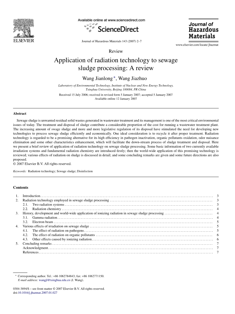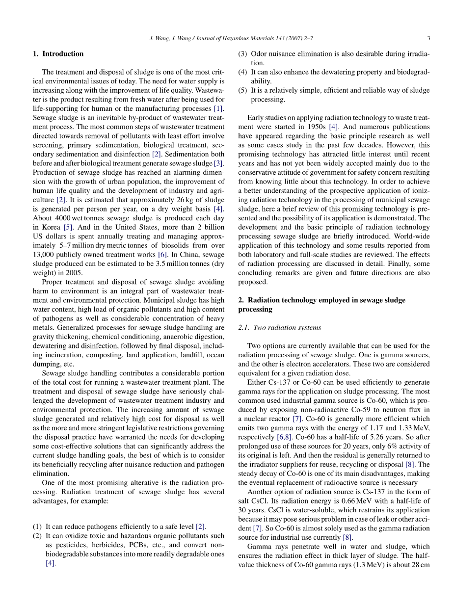 早期辐射技术应用到废物处理的研究是开始于1950年代的[4]。在过去的几十年里基于原理研究以及某些情况下的研究的大量的出版物已经出现了。然而,这个有前途的技术虽然吸引了研究者们的小小的兴趣,但是直到最近几年这个技术尚未被广泛接受,主要是由于政府的保守态度,他们不是很了解这种技术将带来的安全性问题。为了达到对电离辐射这种潜在应用技术在城市污水污泥的处理的更好的理解,这里简要回顾这个有前途的技术以及其应用的可能性。在这里简要介绍了污水污泥处理过程中的辐射技术的发展和基本原理。据实验室和全面研究报道,本文对这种技术在全球范围内的应用和结果进行了综述。辐射处理的影响也进行了较为详细的试验研究。最后,给出了一些结论和对未来的发展方向提出建议。