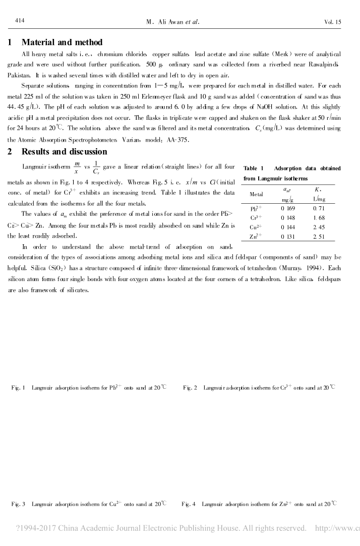 与关于Pb,Cr,Cu和Zn的关系直线,证明了它们在沙子上的吸附也遵循Langmuir吸附模型。